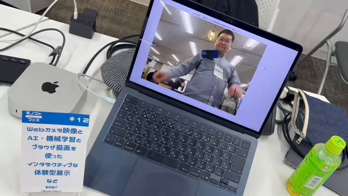 今回の長野での #モノコトフェス 、 ブラウザで動く体験型のインタラクティブなアプリ 2つを展示してます! 流体シミュレーションのものと別の 2つ目は、こちらの透明マント/光学迷彩的なエフェクトを #MediaPipe で検出した手の動きに合わせて出す、というものです #p5js