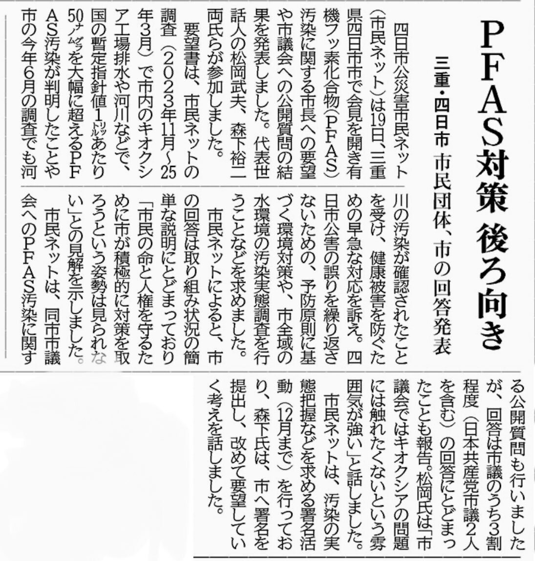 三重・四日市でPFAS汚染が判明も、市の回答は「後ろ向き」。市議会でも問題に触れたくない雰囲気が強いと市民団体が告発。 市民の命と人権を守るのが自治体の責務。四日市公害の過ちを繰り返さぬよう、予防原則に基づく全域汚染調査と対策を!議会も企業に忖度せず責任を果たすべき #PFAS汚染 #赤旗 pic.x.com/1JbZRlS25P