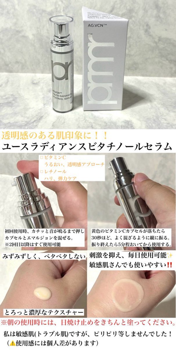 プリメラのユース ラディアンス ビタチノールセラム。 併用があまり推奨されないビタミンC×レチノールをこれ1つで取り入れられる優れもの!初回開封時に2成分を混ぜる専用容器。肌なじみがよく刺激もなくて使いやすい @amorepacific_jp #Qoo10アモパシ購入品紹介 #Qoo10購入品 #プリメラ #primera pic.x.com/FIzq47cBa6