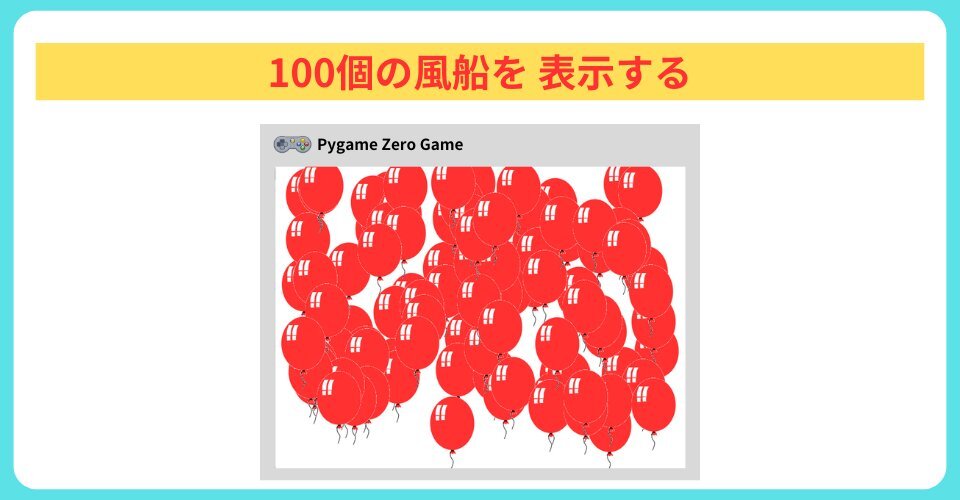 今回は、 100個ある風船を割って boonを探すプログラム。 scratchでいうクローンの作り方を学ぼう! 【Pygame Zero】量産01:100個の風船を表示しよう! - Pythonしよう! URLは、こちら⇩ pythonsiyou.com/spawn01_findbo… #pygamezero #ゲーム #プログラミング #Python #pygame #game pic.x.com/wvN3ki8cqy