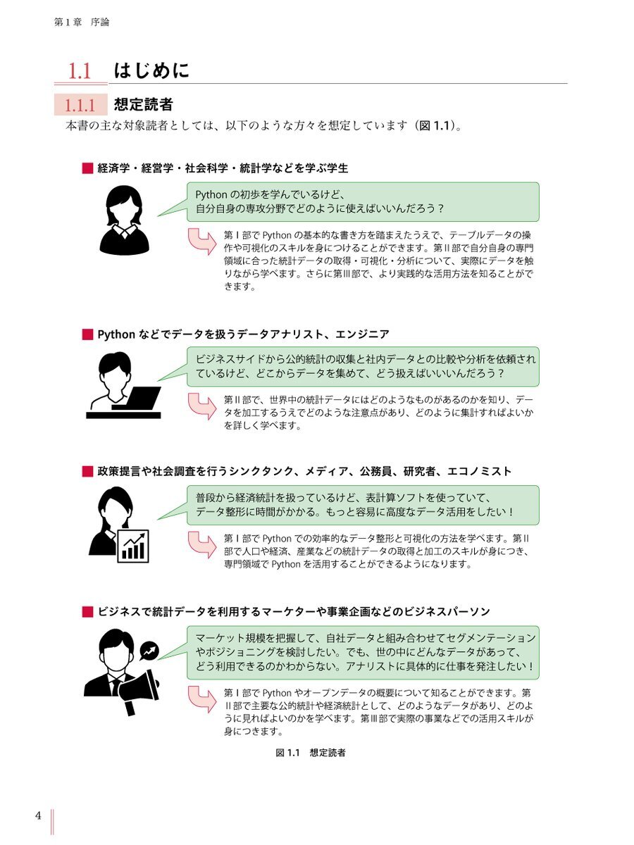 ◤◢◤◢◤◢◤◢◤◢◤◢◤◢◤◢◤◢ 『Pythonではじめるオープンデータ分析』 ✨ご購入の参考に✨ ◤◢◤◢◤◢◤◢◤◢◤◢◤◢◤◢◤◢ 第1章から抜粋👀 📈想定読者 📈前提知識 📈本書の構成と読み方 👇こんな人にぴったりです🤗 👇こんなデータが分析できます📊
