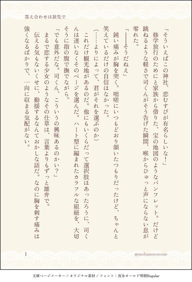 #ritk版深夜の60分一発勝負(@ritk_1h_2 ) 演目「修学旅行」「彼の部屋」+1h 🌟くんの部屋で修学旅行の旅程を練る2人。だけど🌟くんの一言に心がざわついてしまって…な🎈🌟です🍁(1/2) 遅刻参加すみません…!サイスト未読多めなので、齟齬があったら見逃してもらえるとありがたいです…🙏 pic.x.com/LKgQW8lTiY