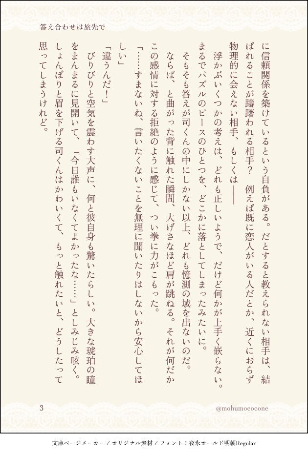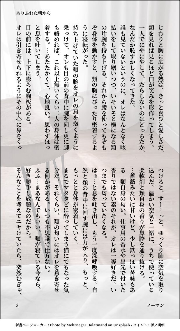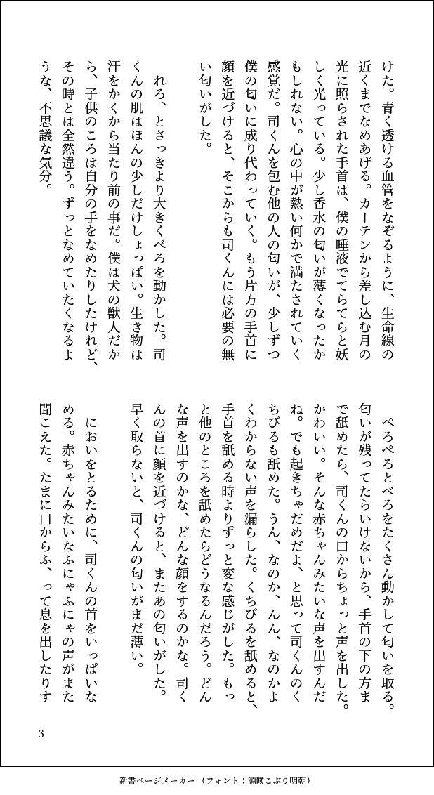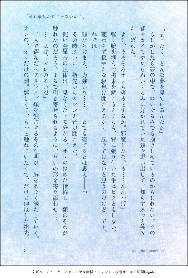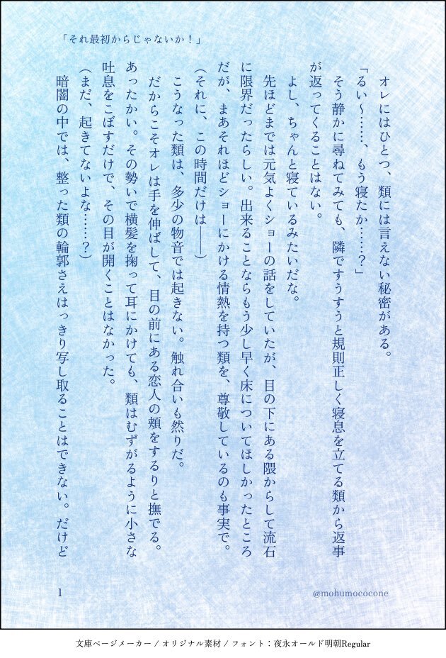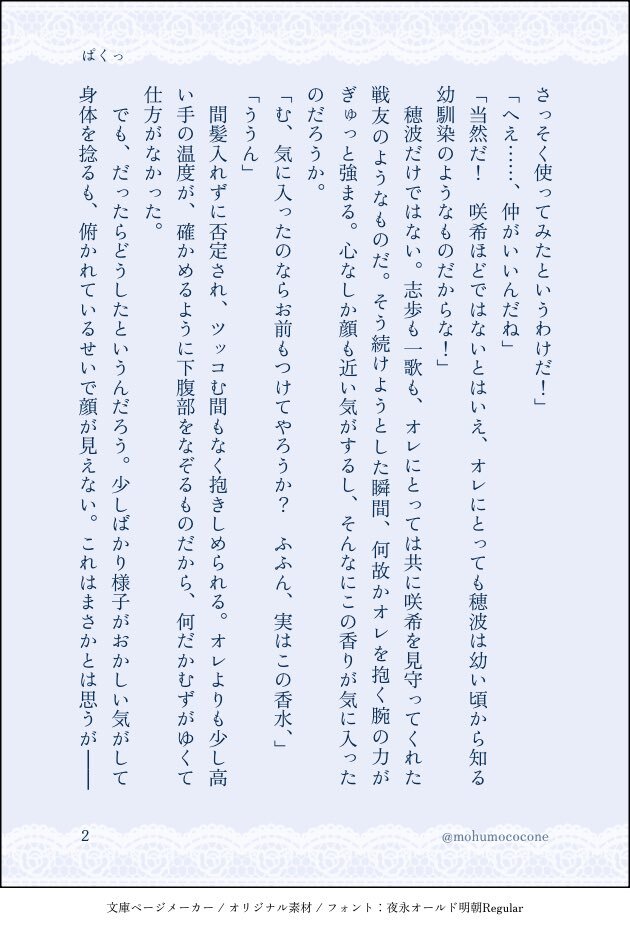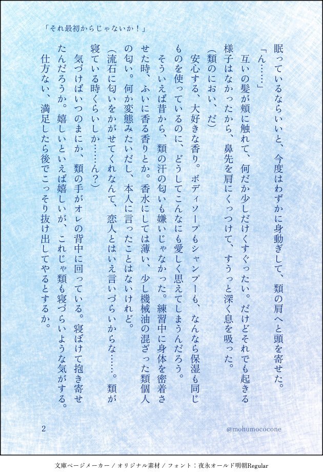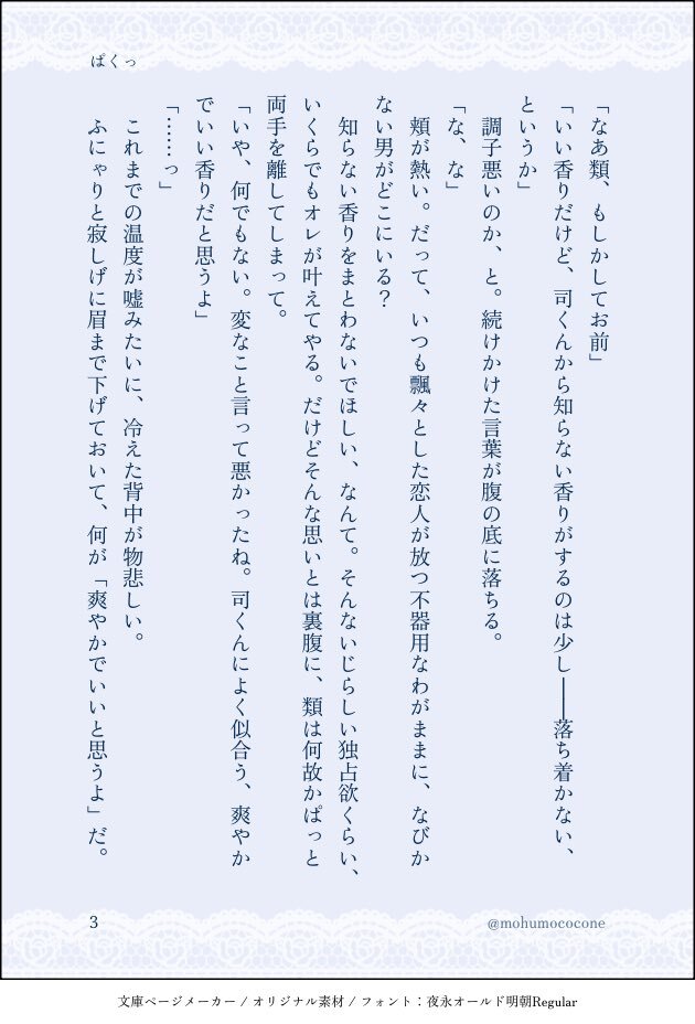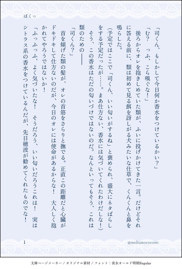 #ritk版深夜の60分一発勝負 (@ritk_1h_2) 演目:香水(2.5h) 🎈🌟※交際済犬主 ︎🌟が付けている香水の匂いが好きじゃなくて、夜寝ている間にこっそり舐め取って匂いを消そうとしたらだんだん変な気分になる🐶🎈の話 ※モブが出ますが無害です ※ひらがなが多く読みづらいシーンが途中で入ります(4/7) pic.x.com/szIOGgcKiw