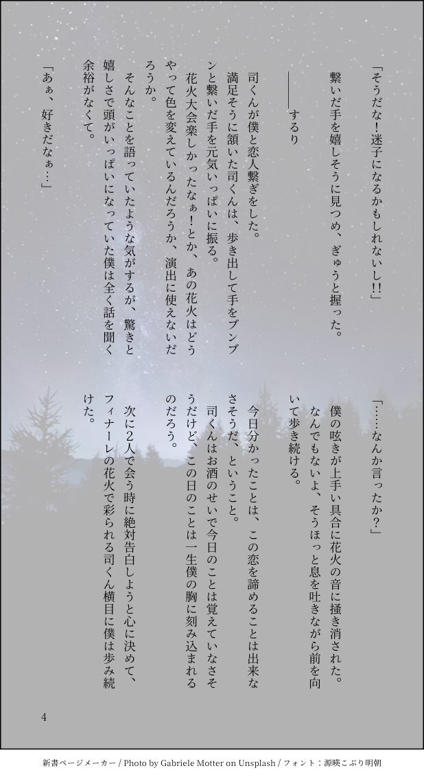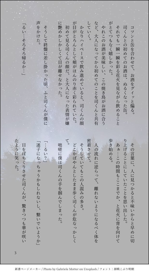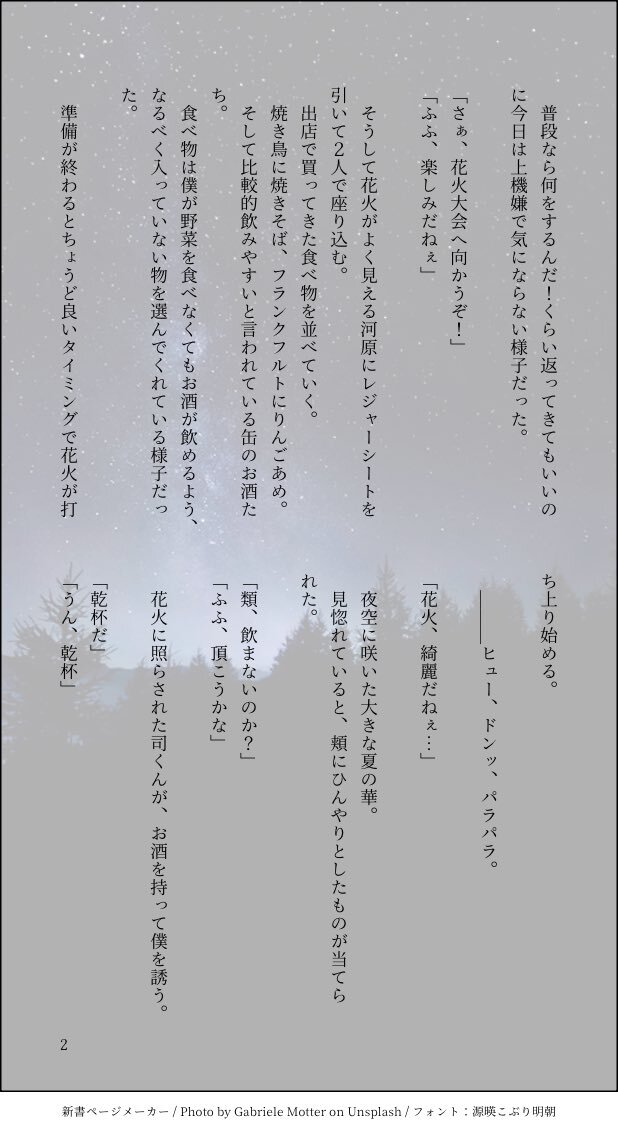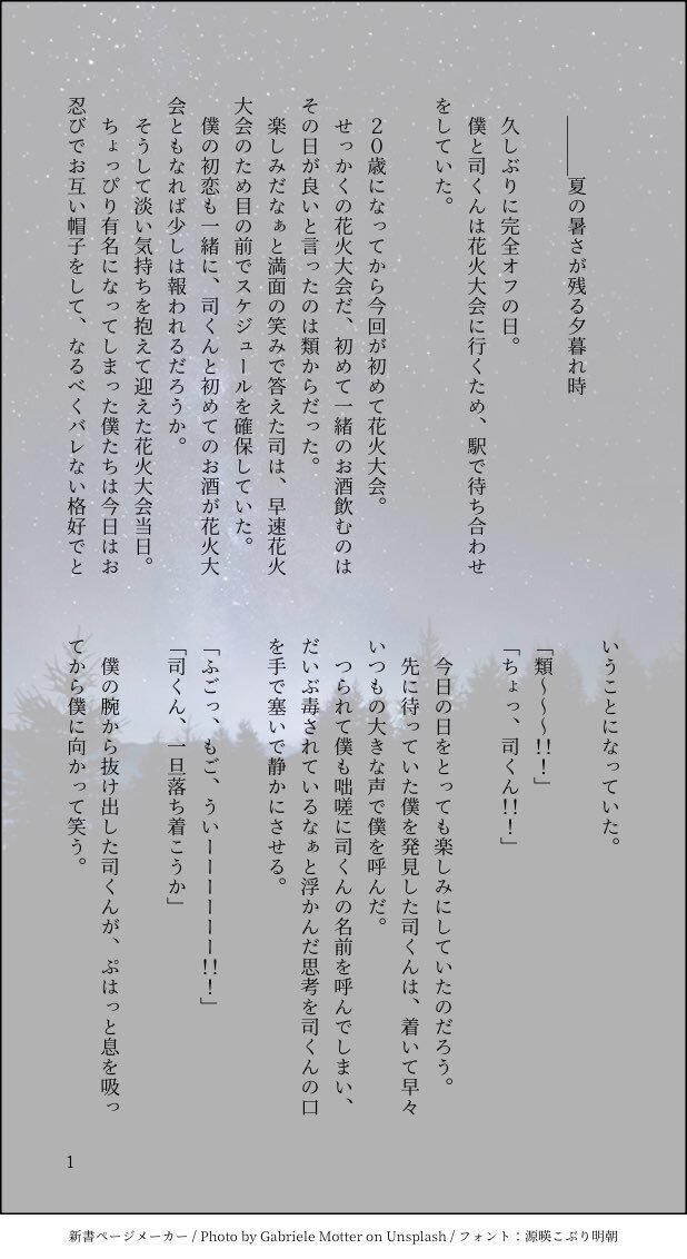 #ritk版深夜の60分一発勝負 (@ritk_1h_2 ) 演目『オフの日』+1.5h オフの日に両片思いの🎈🌟が花火を見に行く話。 大学生設定、飲酒表現あり。 pic.x.com/GzRGRO47XX