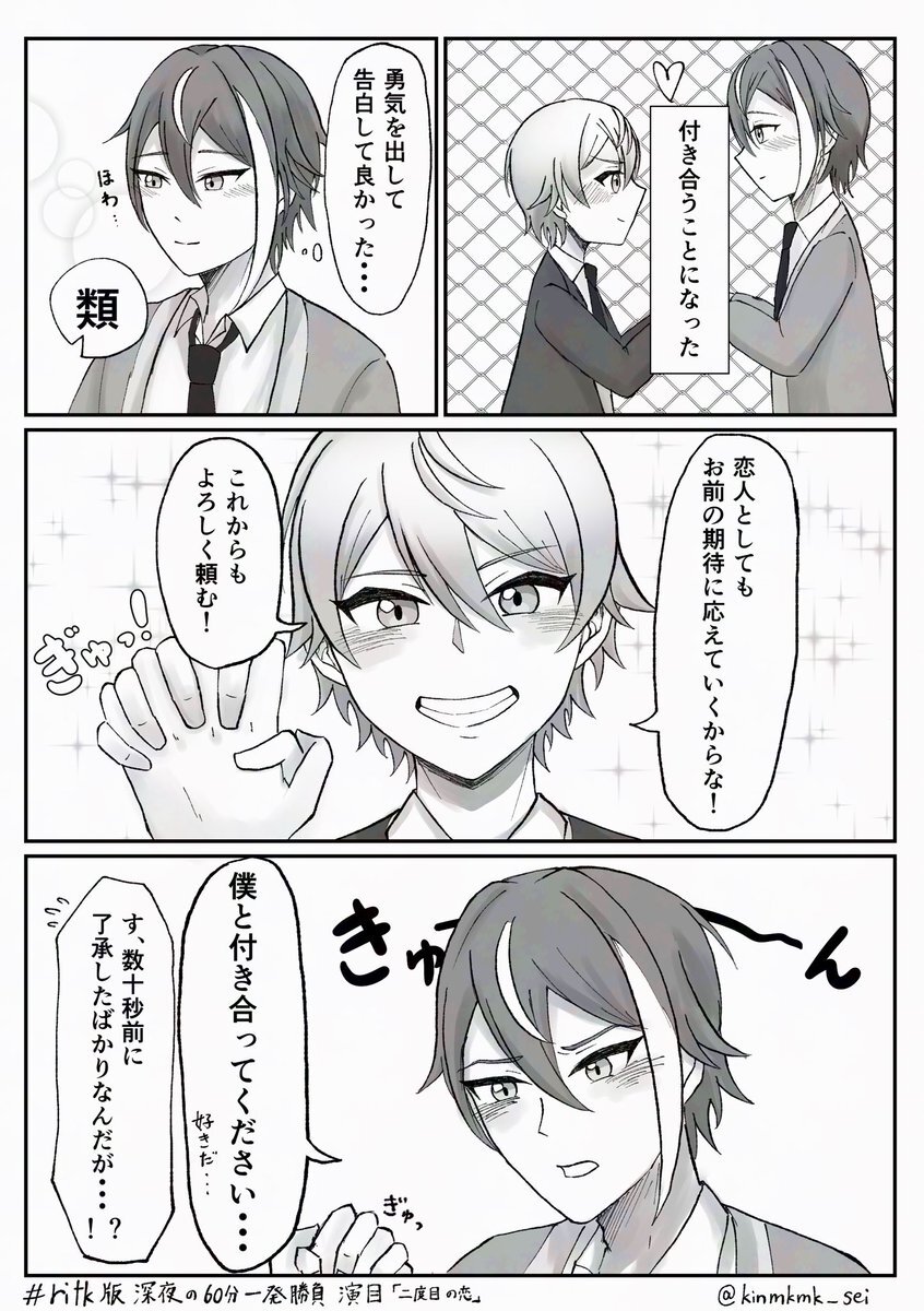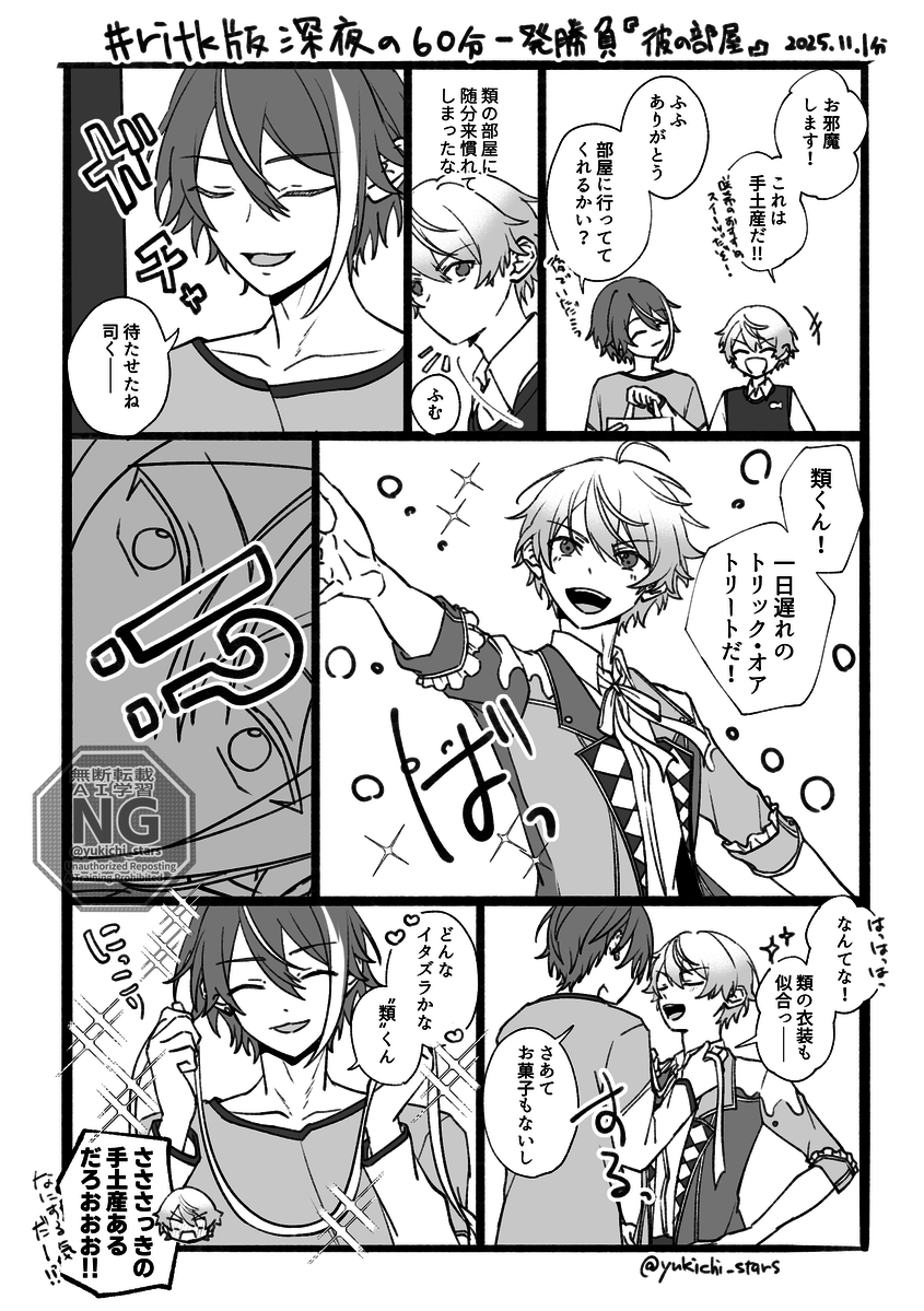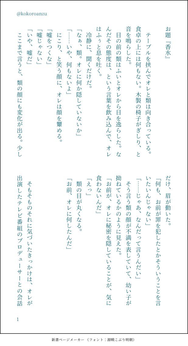 #ritk版深夜の60分一発勝負(@ritk_1h_2 ) 演目「香り」「ペアリング」+1h 成人済、一緒に暮らしている二人だけど、最近🌟くんには🎈くんに言えない秘密があり──な🎈🌟です(1/2) 遅刻参加な上再掲すみません…!ページの抜けがあったようで…読んでいただいた方申し訳ないです😭 pic.x.com/1PndNd8WFY