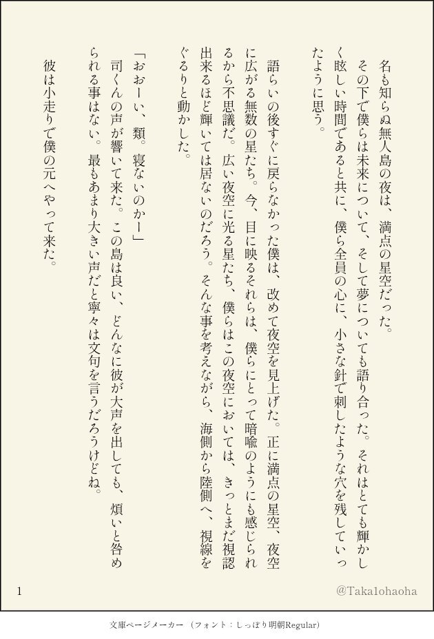 #ritk版深夜の60分一発勝負 (@ritk_1h_2) 演目:背中合わせ🎈🌟 (+0.5h) 無人島の夜に、二人で星を見上げるだけの話。🎈→🌟片想いです。 pic.x.com/SYmfk0kUoA