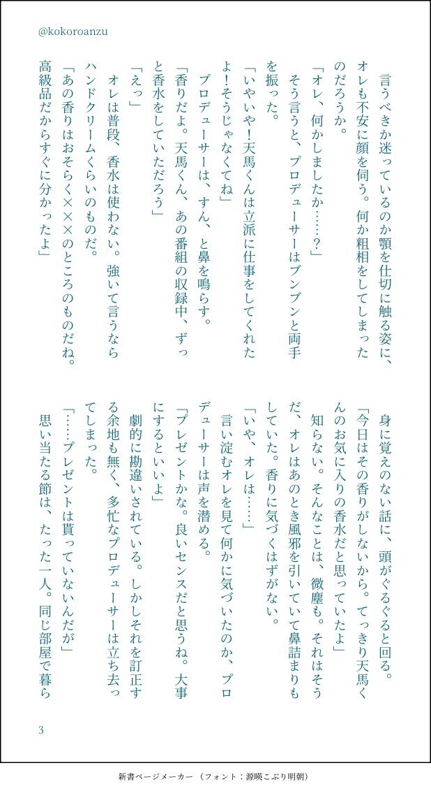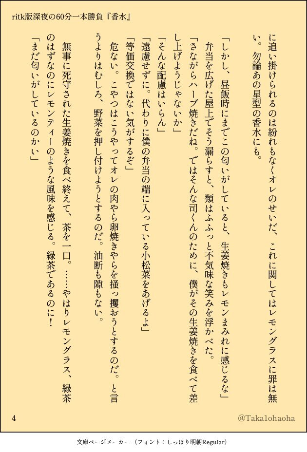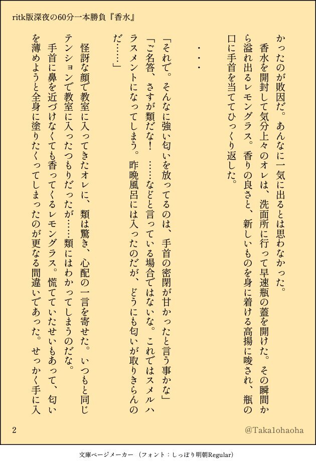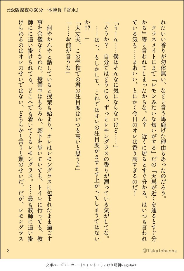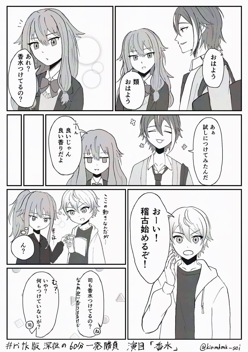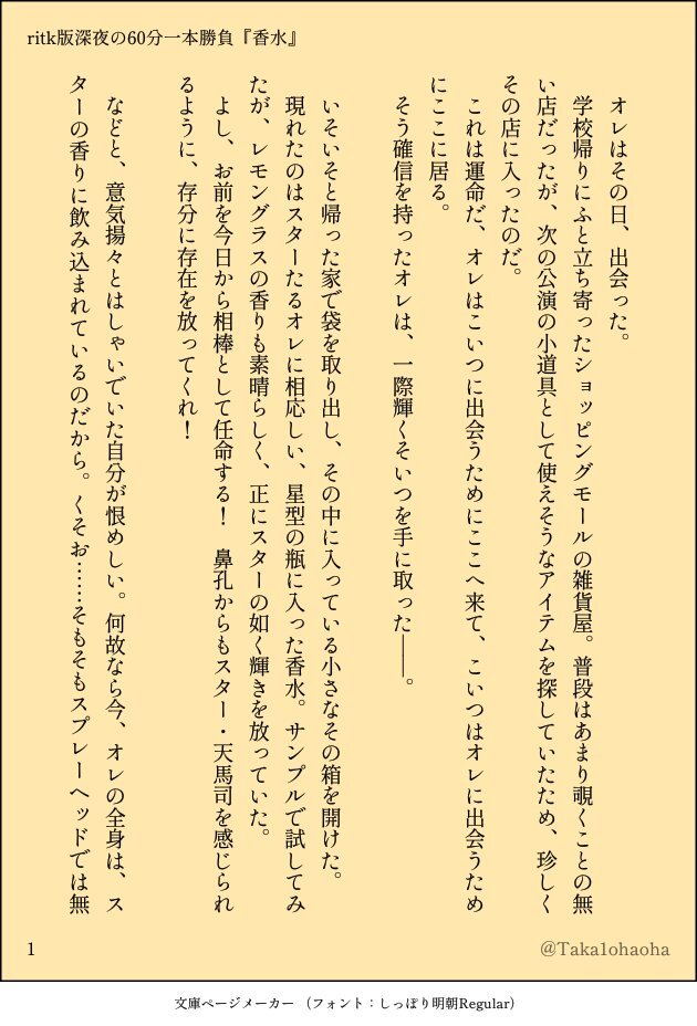 #ritk版深夜の60分一発勝負 (@ritk_1h_2) 演目:香水🎈🌟(+1.5h) 遅刻ですみません!参加させていただきました! 香水を買ったけれど付けすぎてしまった🌟くんの話。 (4/8) pic.x.com/MC6GFqXRoD