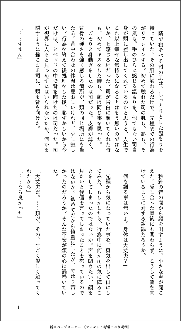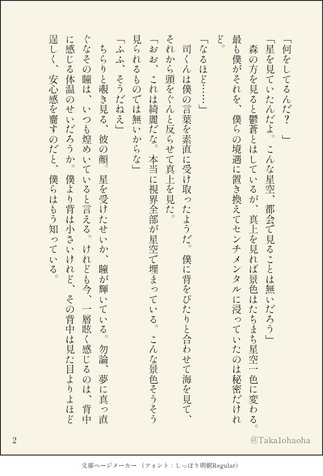#ritk版深夜の60分一発勝負(@ritk_1h_2) 演目:背中合わせ 🎈︎🌟 初体験後のピロートークで🌟の感情の変化の兆しを🎈が感じる話 初体験について「ヒリヒリした」(※物理的な意味ではない)と︎🌟に言わせたかっただけ 🎈は恋をしてから、︎🌟は付き合ってから色々な初めての感情を覚えていきそう pic.x.com/peeAglu4uJ