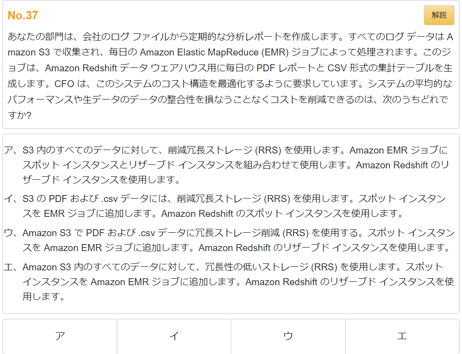 【試験区分】AWS認定資格 SAP(ソリューションアーキテクト - プロフェッショナル) 【第37問】 EMRのコスト削減策 ※正解・解説はリプライツイート #SAP #AWS認定 pic.x.com/sYT5xnnfxD