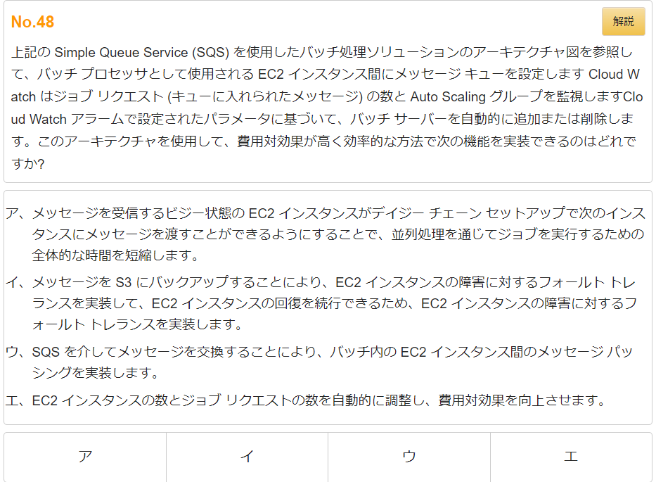 【試験区分】AWS認定資格 SAP(ソリューションアーキテクト - プロフェッショナル) 【第48問】 バッチ処理におけるSQS利用の効果的な方法 ※正解・解説はリプライツイート #SAP #AWS認定 pic.x.com/gtccXcpzFm