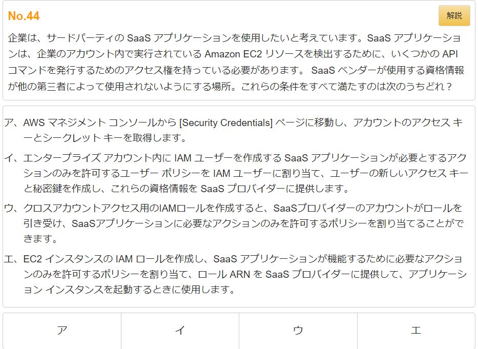 【試験区分】AWS認定資格 SAP(ソリューションアーキテクト - プロフェッショナル) 【第44問】 SaaSアプリケーションに必要なアクセス権を与える方法 ※正解・解説はリプライツイート #SAP #AWS認定 pic.x.com/n7LTB1qDKb