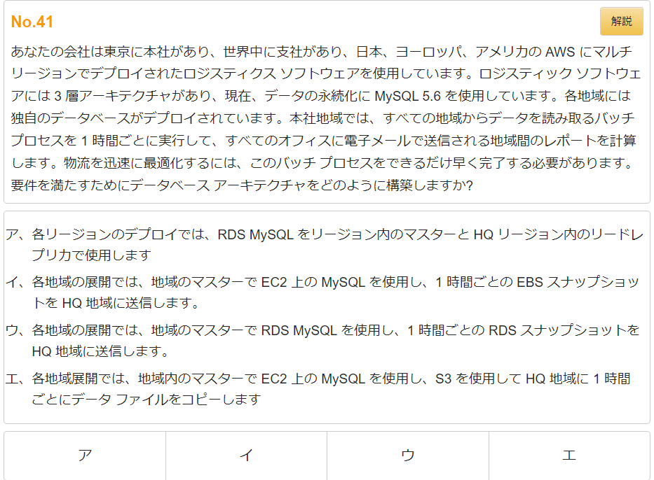 【試験区分】AWS認定資格 SAP(ソリューションアーキテクト - プロフェッショナル) 【第41問】 データベースアーキテクチャの構築方法 ※正解・解説はリプライツイート #SAP #AWS認定 pic.x.com/sRkuHGdzep