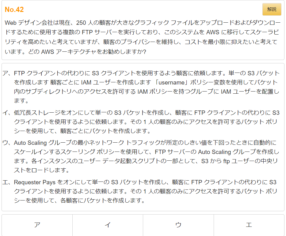 【試験区分】AWS認定資格 SAP(ソリューションアーキテクト - プロフェッショナル) 【第42問】 AWSにおけるFTPサーバーの移行に関するアーキテクチャ選択肢 ※正解・解説はリプライツイート #SAP #AWS認定 pic.x.com/Bv6Q9ashmN