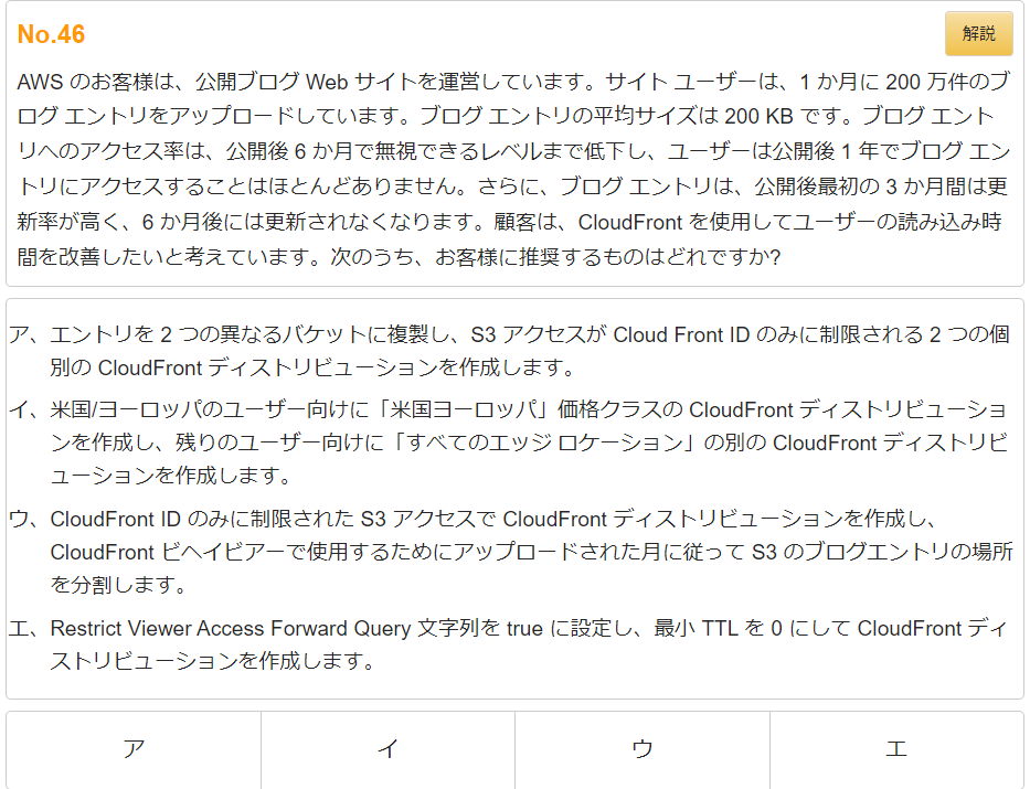 【試験区分】AWS認定資格 SAP(ソリューションアーキテクト - プロフェッショナル) 【第46問】 CloudFrontとS3を使ったブログサイトの改善方法 ※正解・解説はリプライツイート #SAP #AWS認定 pic.x.com/ynfsVYIwPK