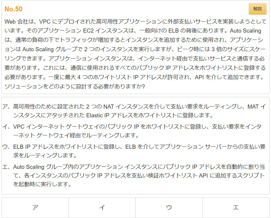 【試験区分】AWS認定資格 SAP(ソリューションアーキテクト - プロフェッショナル) 【第50問】 VPC内の高可用性アプリケーションに外部支払いサービスを実装する方法は? ※正解・解説はリプライツイート #SAP #AWS認定 pic.x.com/doo8S93BZR