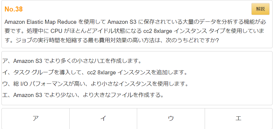 【試験区分】AWS認定資格 SAP(ソリューションアーキテクト - プロフェッショナル) 【第38問】 EMRでのデータ分析時、ジョブの実行時間を短縮する方法 ※正解・解説はリプライツイート #SAP #AWS認定 pic.x.com/qiD2LjleuV