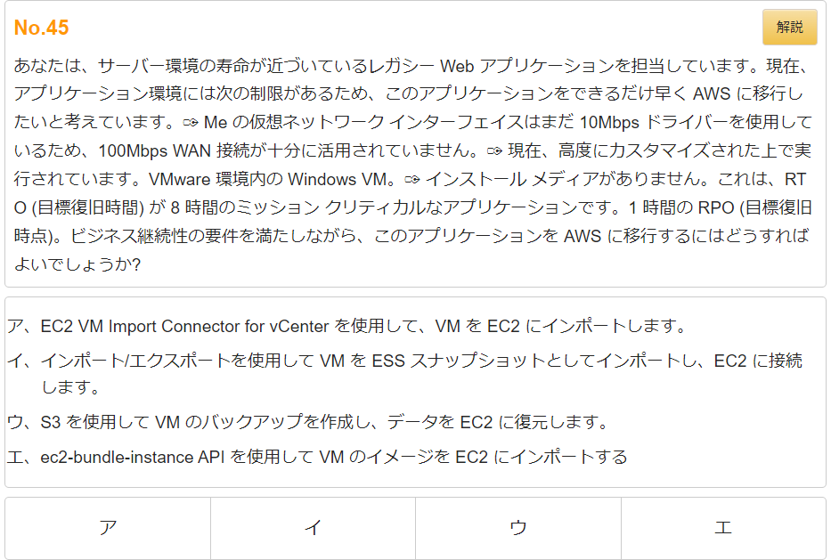 【試験区分】AWS認定資格 SAP(ソリューションアーキテクト - プロフェッショナル) 【第45問】 AWS移行のビジネスコンティニュイティを確保する方法 ※正解・解説はリプライツイート #SAP #AWS認定 pic.x.com/c7sGRgHg0q