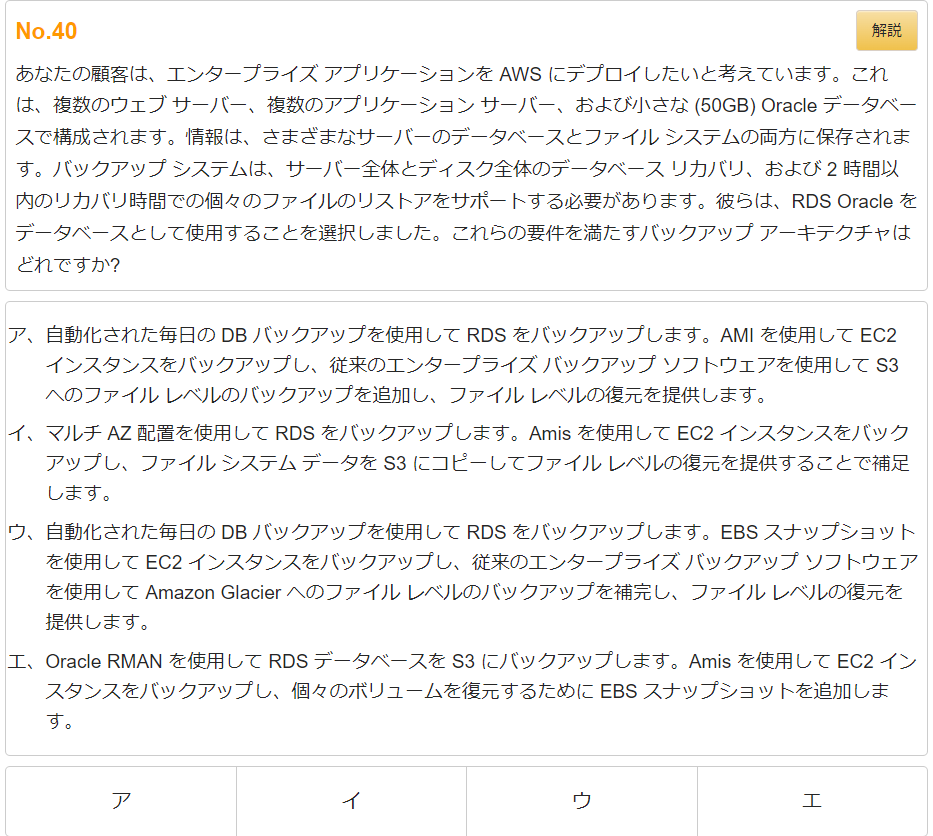 【試験区分】AWS認定資格 SAP(ソリューションアーキテクト - プロフェッショナル) 【第40問】 エンタープライズアプリケーションのバックアップアーキテクチャ ※正解・解説はリプライツイート #SAP #AWS認定 pic.x.com/lKh6jvQCQH