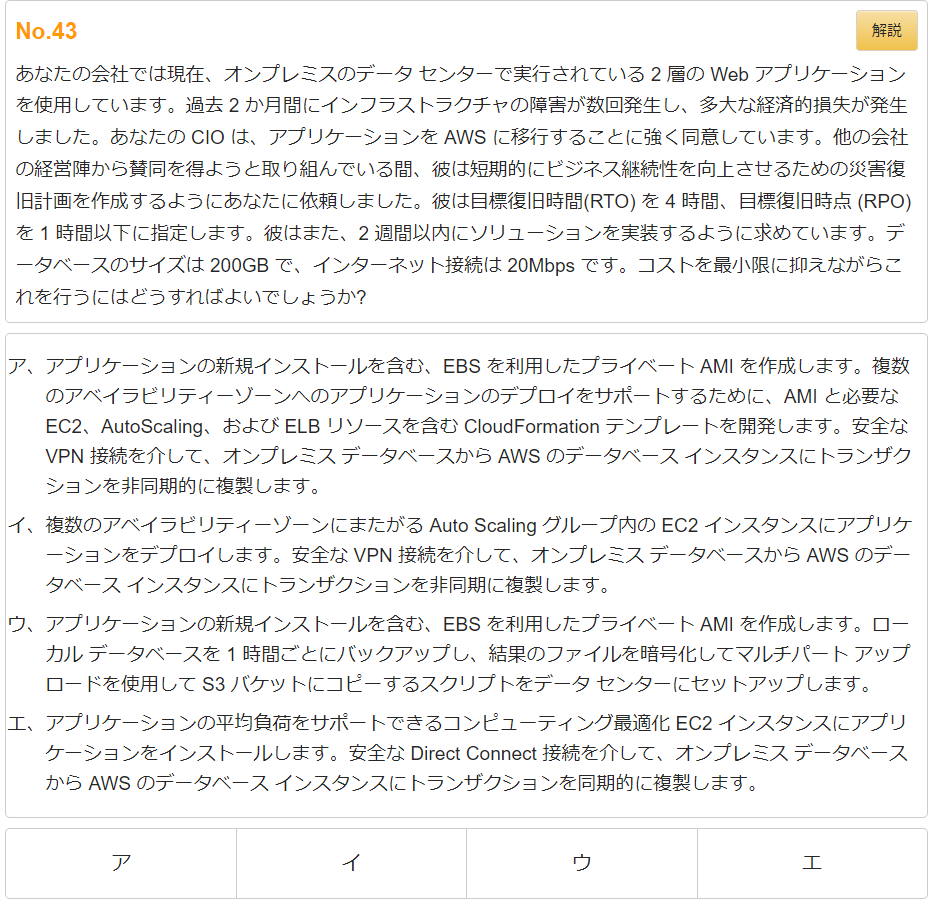 【試験区分】AWS認定資格 SAP(ソリューションアーキテクト - プロフェッショナル) 【第43問】 2層WebアプリケーションのAWS移行に伴う災害復旧計画 ※正解・解説はリプライツイート #SAP #AWS認定 pic.x.com/0zAPfKWkqL