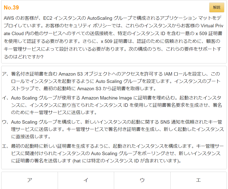 【試験区分】AWS認定資格 SAP(ソリューションアーキテクト - プロフェッショナル) 【第39問】 AutoScalingグループでx509証明書を使用する方法 ※正解・解説はリプライツイート #SAP #AWS認定 pic.x.com/clahGJ3siW