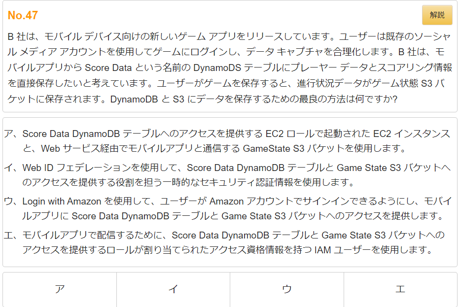 【試験区分】AWS認定資格 SAP(ソリューションアーキテクト - プロフェッショナル) 【第47問】 モバイルアプリでのデータ保存について ※正解・解説はリプライツイート #SAP #AWS認定 pic.x.com/X9l74VsBuT