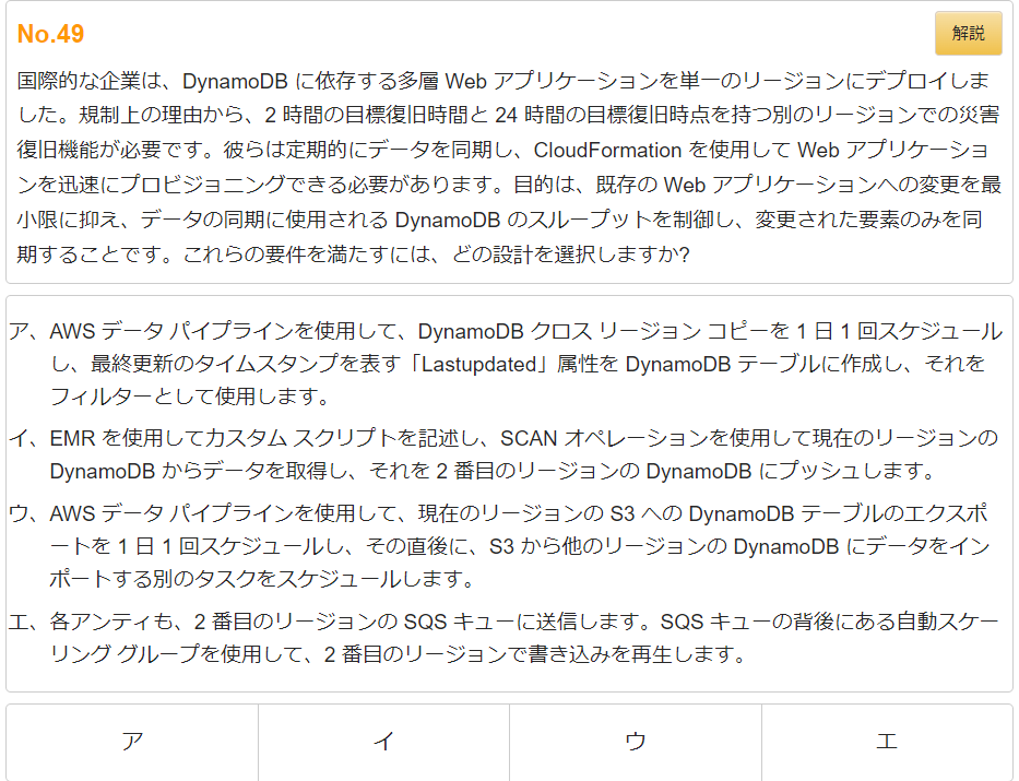【試験区分】AWS認定資格 SAP(ソリューションアーキテクト - プロフェッショナル) 【第49問】 AWSによる多層Webアプリケーションの災害復旧機能の設計 ※正解・解説はリプライツイート #SAP #AWS認定 pic.x.com/w3On93ySxM