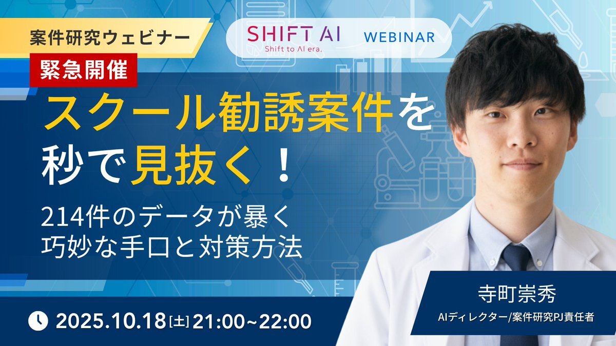【🚨緊急ウェビナー開催決定!🚨】 先日多くの情報をお寄せいただいた 「詐欺まがい案件」 皆さんの声を受け SHIFT AI会員限定で緊急対策ウェビナーを 開催します! 巧妙化する「スクール勧誘案件」から身を守る! 214件に及ぶ実例データを徹底分析し ✅ よくある手口の共通パターン ✅ x.com/18015550691183…