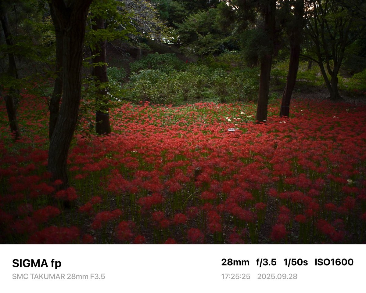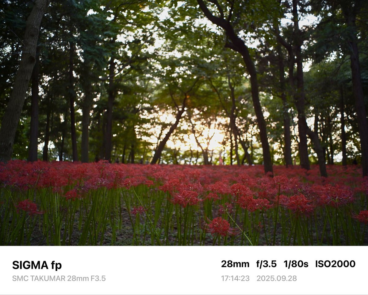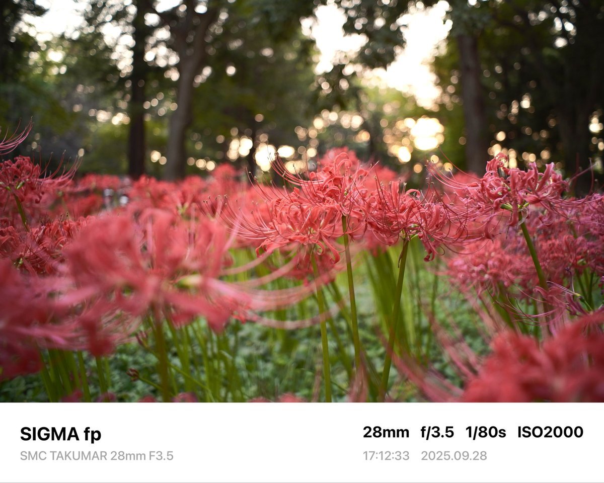 レンズ広角にした。周辺減光が良い感じ。 Camera→SIGMA fp Lens→SMC TAKUMAR 28mm F3.5 #sigma #sigmafp #pentax #smctakumar28mmf35 #photography #japan #オールドレンズ #oldlens #村上緑地公園 #彼岸花 pic.x.com/NT2Skd9oU1
