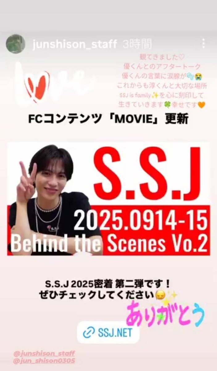 S.S.J 2025 Behind the Scenes 〜Vo.2待ってました💕 ありがとうございます😃 SSJはファミリー✨✨✨ アフタートークの優くんの言葉に涙が出そうでした😭 私なりに精一杯淳くんを応援していきますね💖💖💖 #志尊淳 #SSJ #SSJ2025 ssj.net/member/movie/4…