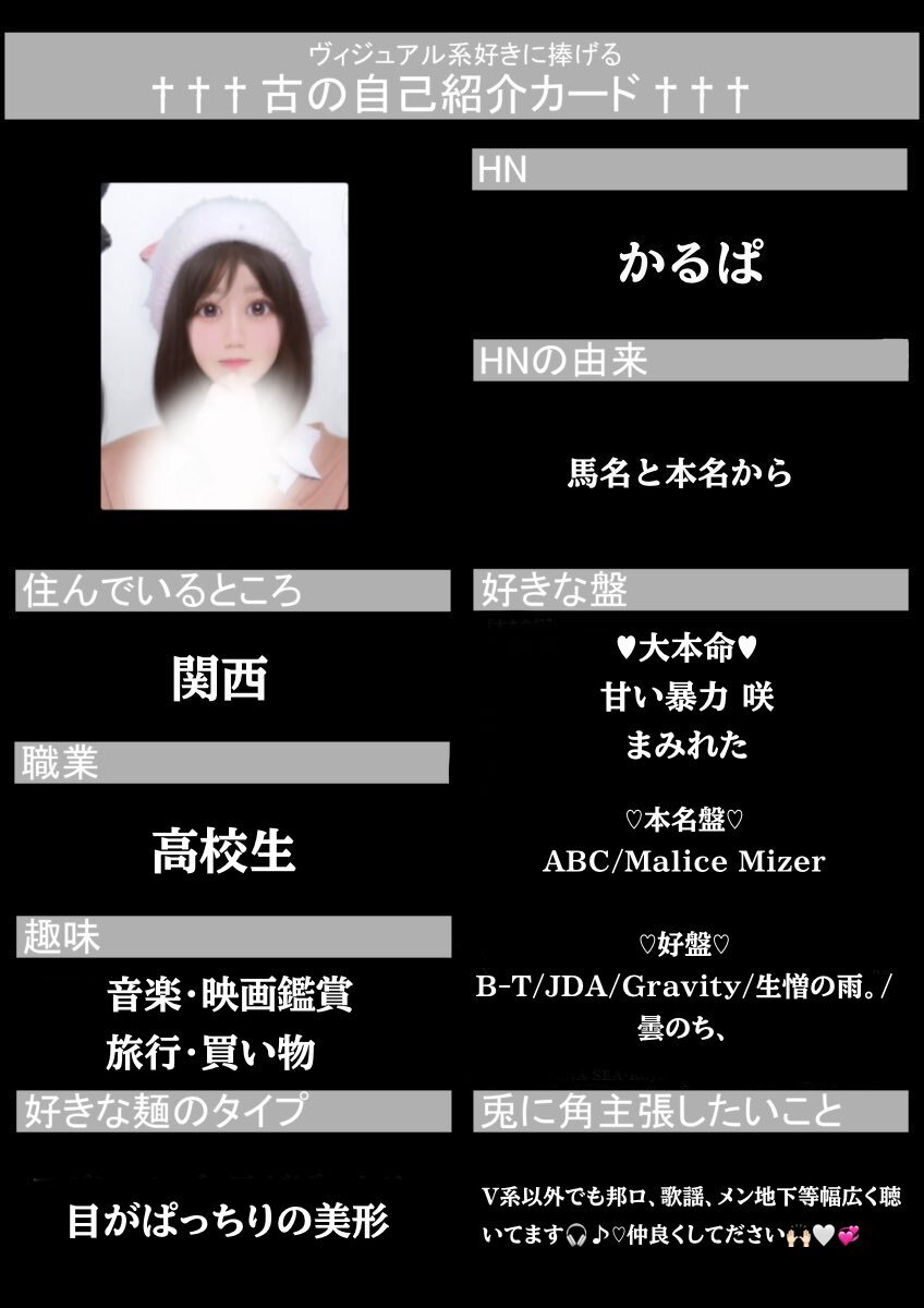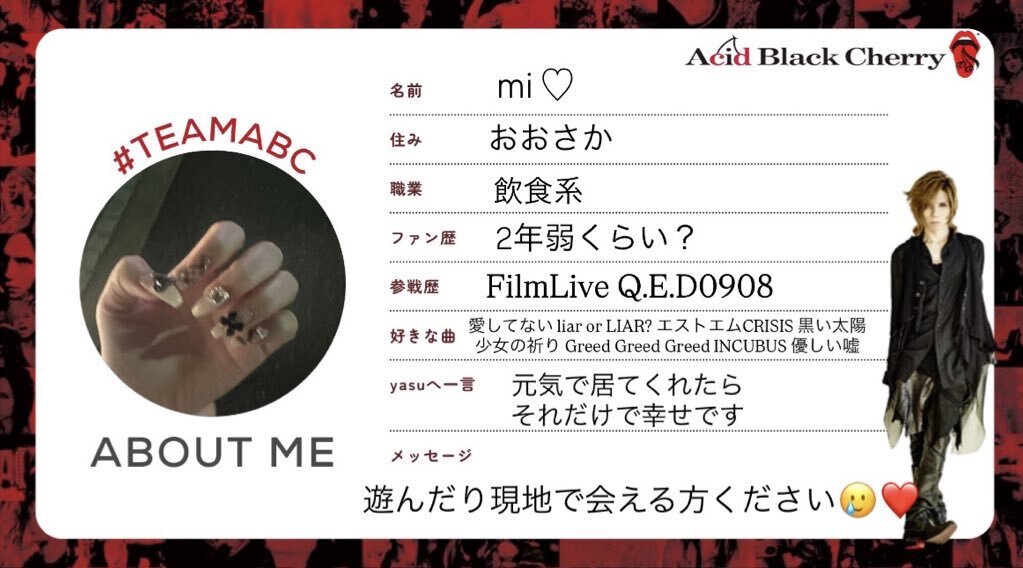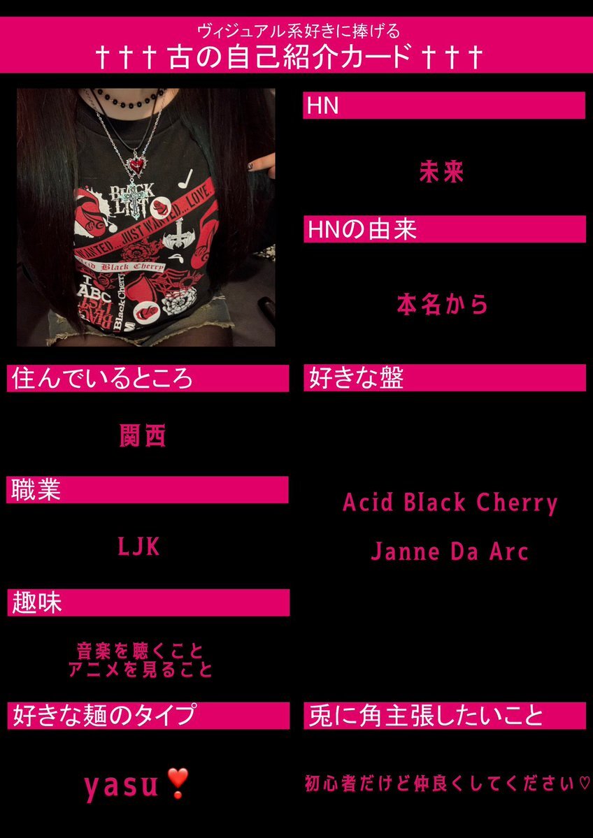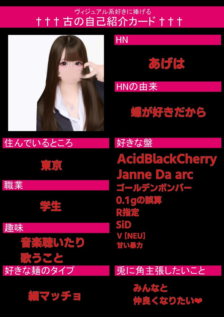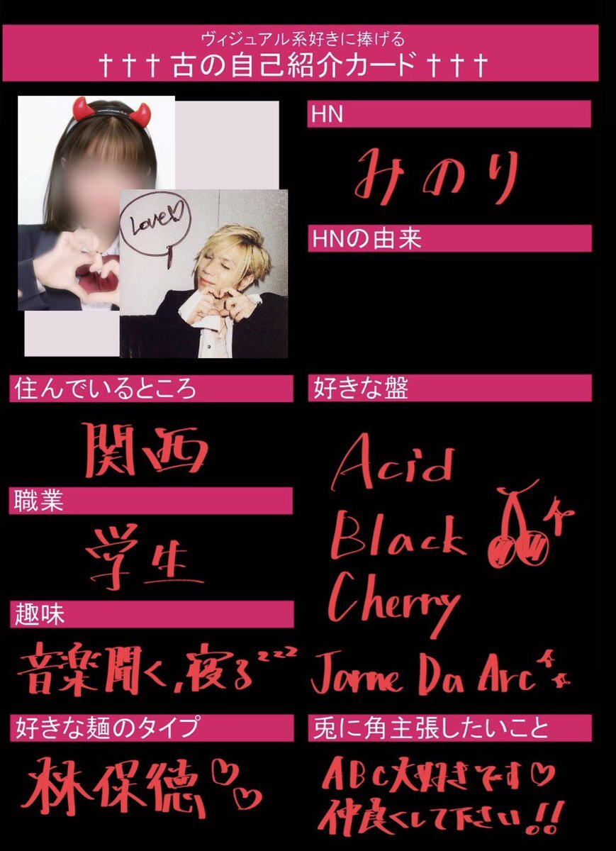 #古の自己紹介カード 作り直しました𐅁𐀸𐋠𛰙᭜𖫴𖫰𖫱𖫳𖫲𖫲𖫳𖫴𖫰𖫱꛰ﯩᩝ︪᭜𖫴𖫰𖫱𖫳𖫲𖫲𖫳𖫴𖫰𖫱꛰ީᩝ𛰚♩ 仲よくなれるお友だち沢山ほしいです🍒🖤 #古の自己紹介カード #V系好きな人と繋がりたい #TeamABC #TeamABCと繋がりたい #AcidBlackCherry #林保徳 ❤︎ pic.x.com/gYioWuEUwJ