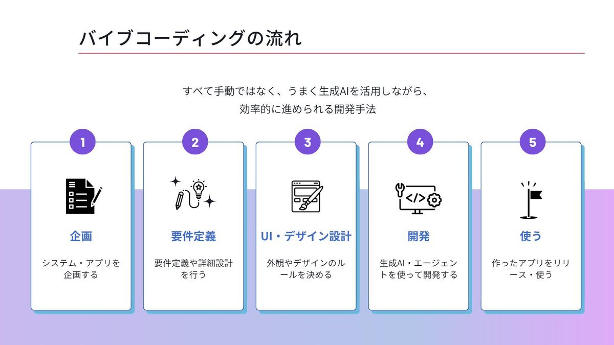 企画内容をAIに伝えるだけで開発が進む時代。 企画→要件定義→UI/デザイン設計→開発→使う 各フェーズで生成AIが実装を担当。 これからは、AIをうまく活用する力以外に、プロジェクトマネジメント力とか、ディレクション力が問われるようになりそうですね。 #VibeCoding #生成AI #AI開発 pic.x.com/dyc8ohR1G6