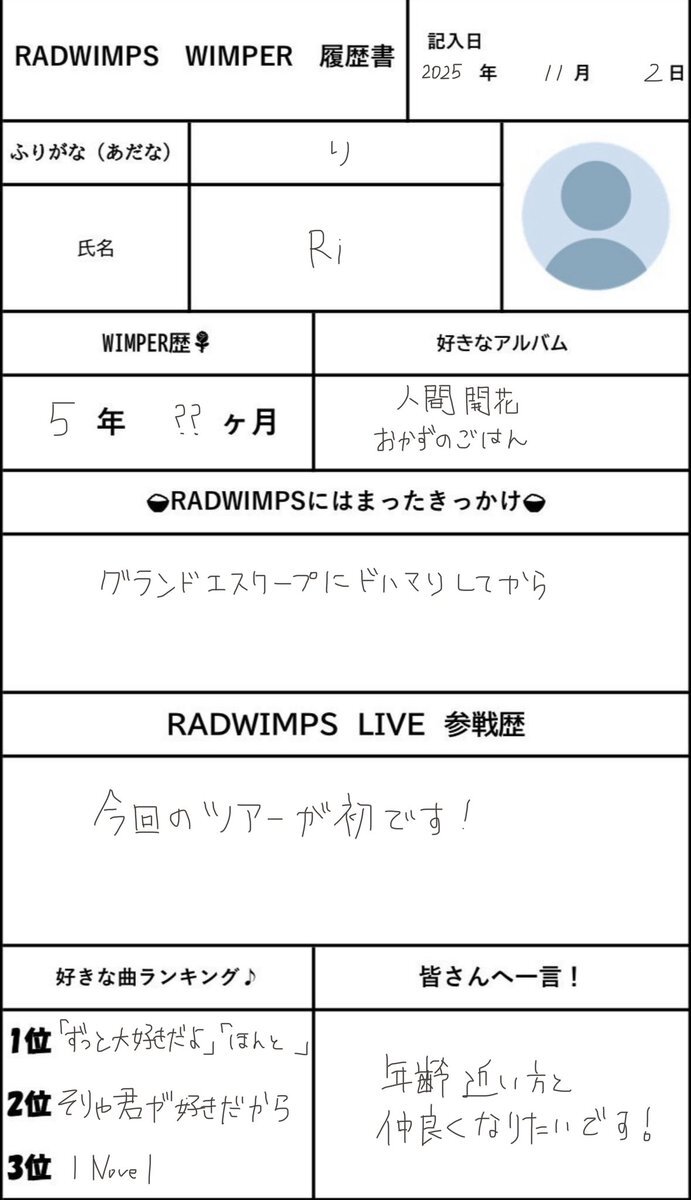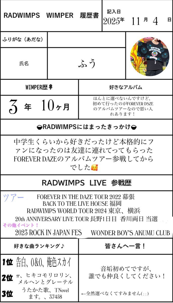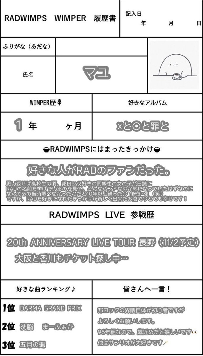 はじめまして! 見る専だったけどRADWIMPS垢作りました♪ 今回のツアーは、長野1日目参戦済み、香川両日予定です☺️ 沢山のwimperさんと繋がりたいので是非仲良くしてください🙌🌹 履歴書画像お借りしました!🙇🏻‍♀️ #RADWIMPS #wimperさんと繋がりたい #RADWIMPS好きな人と繋がりたい #RADWIMPS20th pic.x.com/xxNwehz9k8
