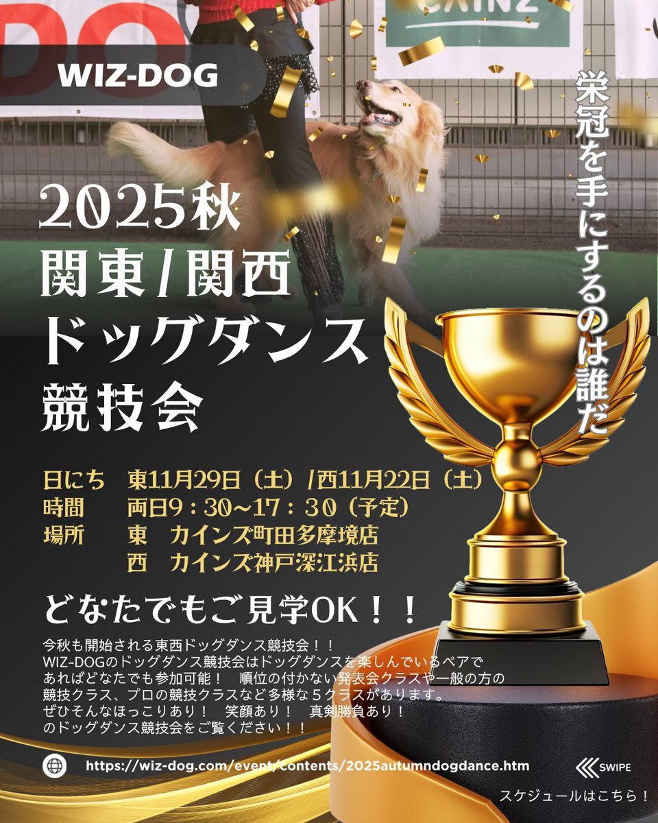 WIZ-DOG目玉イベント!! ドッグダンス競技会が今月末に東西で開催されます✨✨この機会にぜひご見学にお越しください🙋‍♀️ ✉️info@wiz-dog.com 📞03-5755-5364 スケジュール↓ wiz-dog.com/event/contents… #wizdog #wizdogacademy #ドッグダンス #ドッグダンス競技会 #カインズ多摩境 #カインズ神戸深江浜 pic.x.com/wdW9qHqXiJ