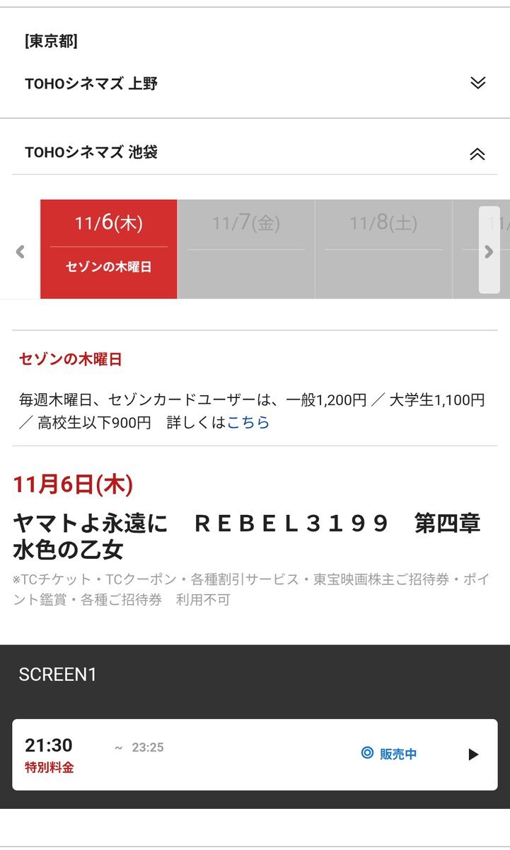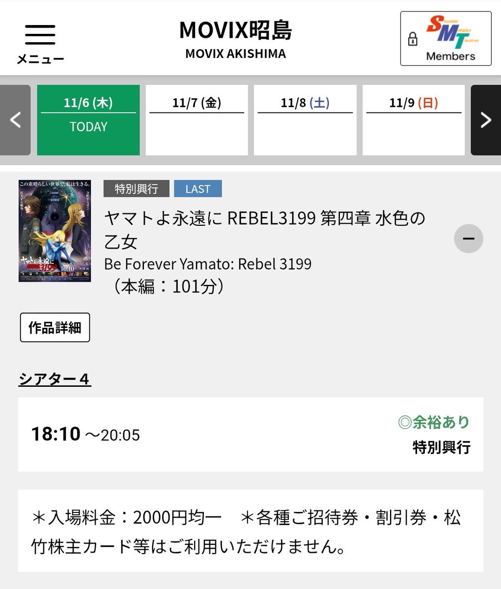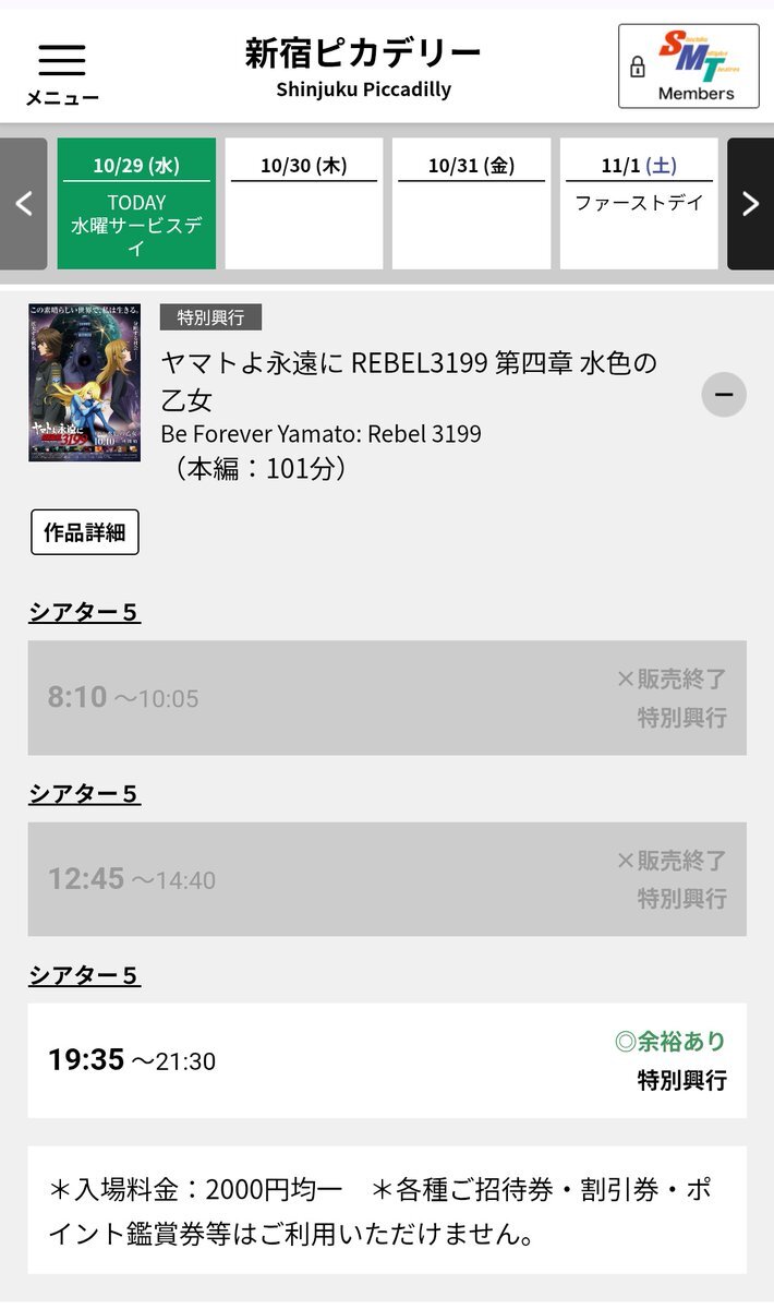 TOHOシネマズ池袋のSCREEN8で 『ヤマトよ永遠に REBEL3199』第四章 水色の乙女 第3週7日目の21:55-23:50の回を鑑賞。 TOHOシネマズは連休頃にヤマトの上映が無い劇場が多く、池袋は11/1-11/3にヤマト無し。 上野は10/31も無し #宇宙戦艦ヤマト #yamato3199 #TOHOシネマズ池袋 #TOHOシネマズ pic.x.com/cJHSkMCiNj