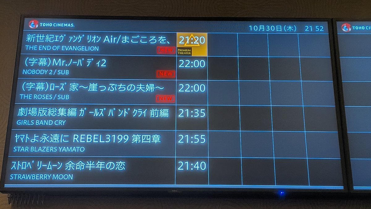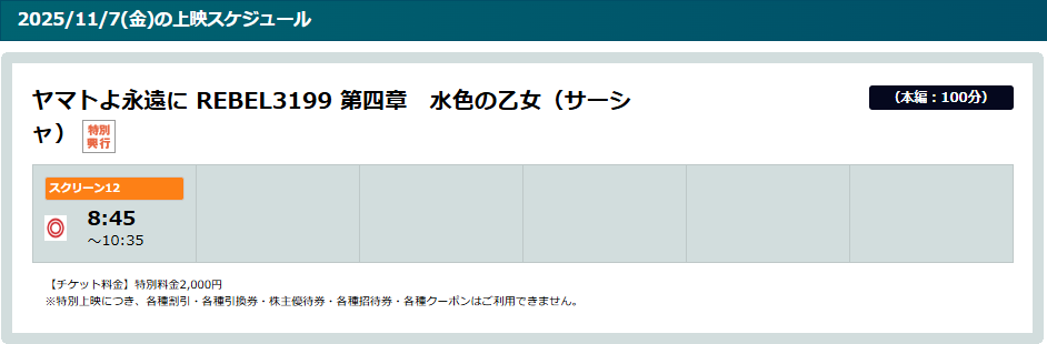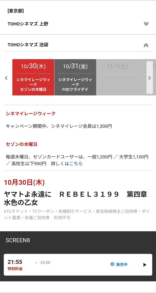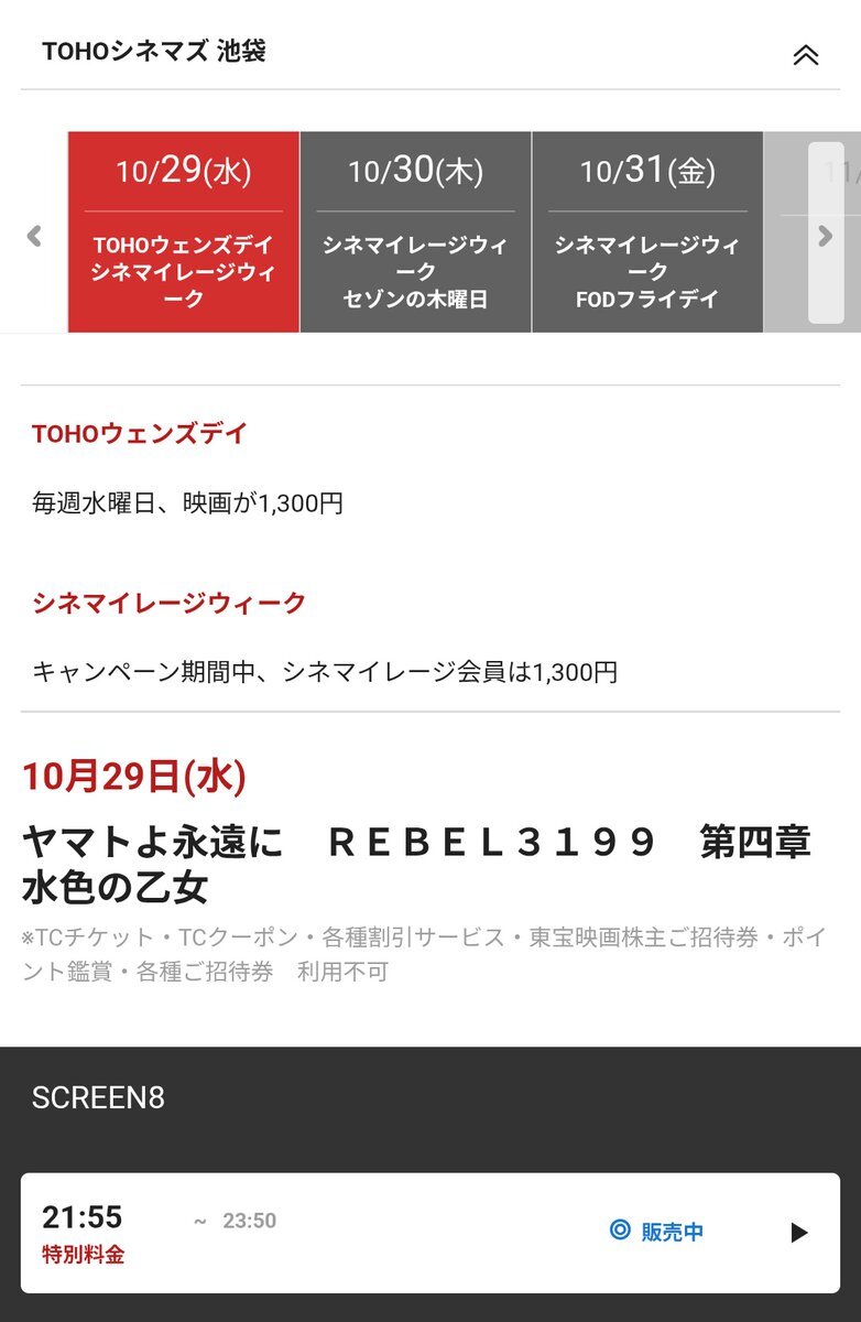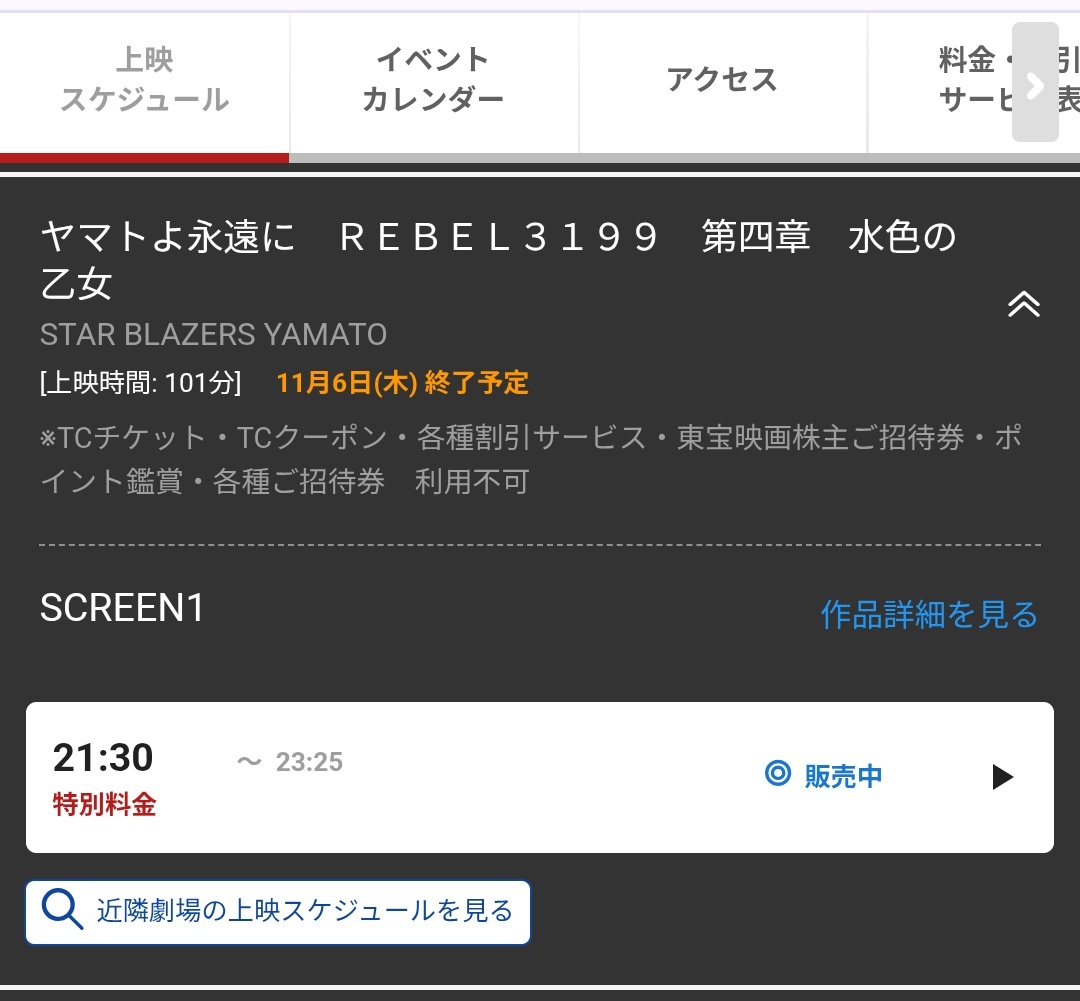TOHOシネマズ池袋のSCREEN8で 『ヤマトよ永遠に REBEL3199』第四章 水色の乙女 第3週7日目の21:55-23:50の回を鑑賞。 TOHOシネマズは連休頃にヤマトの上映が無い劇場が多く、池袋は11/1-11/3にヤマト無し。 上野は10/31も無し #宇宙戦艦ヤマト #yamato3199 #TOHOシネマズ池袋 #TOHOシネマズ pic.x.com/cJHSkMCiNj