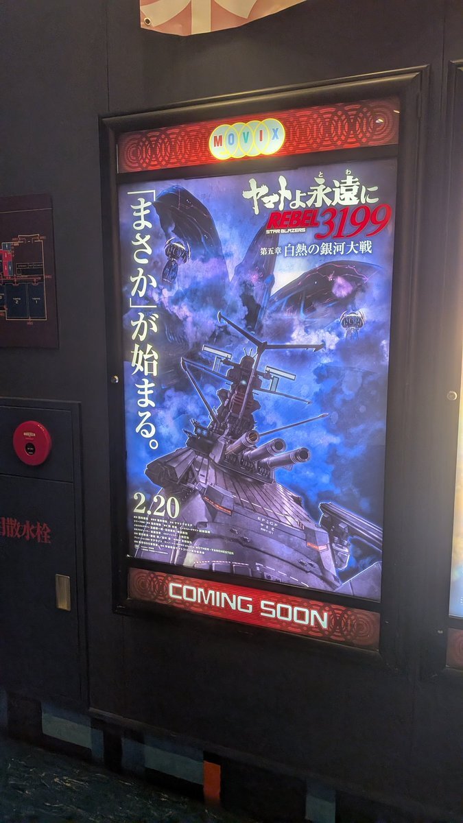 MOVIX昭島のシアター4で 『ヤマトよ永遠に REBEL3199』第四章 水色の乙女 第4週最終日の18:10-20:05の回を鑑賞。 昭島は、これで最終上映! ロビーには第五章のポスターがありました。 次は2月20日ですね。 #宇宙戦艦ヤマト #yamato3199 #MOVIX昭島 pic.x.com/8CjymAzasp