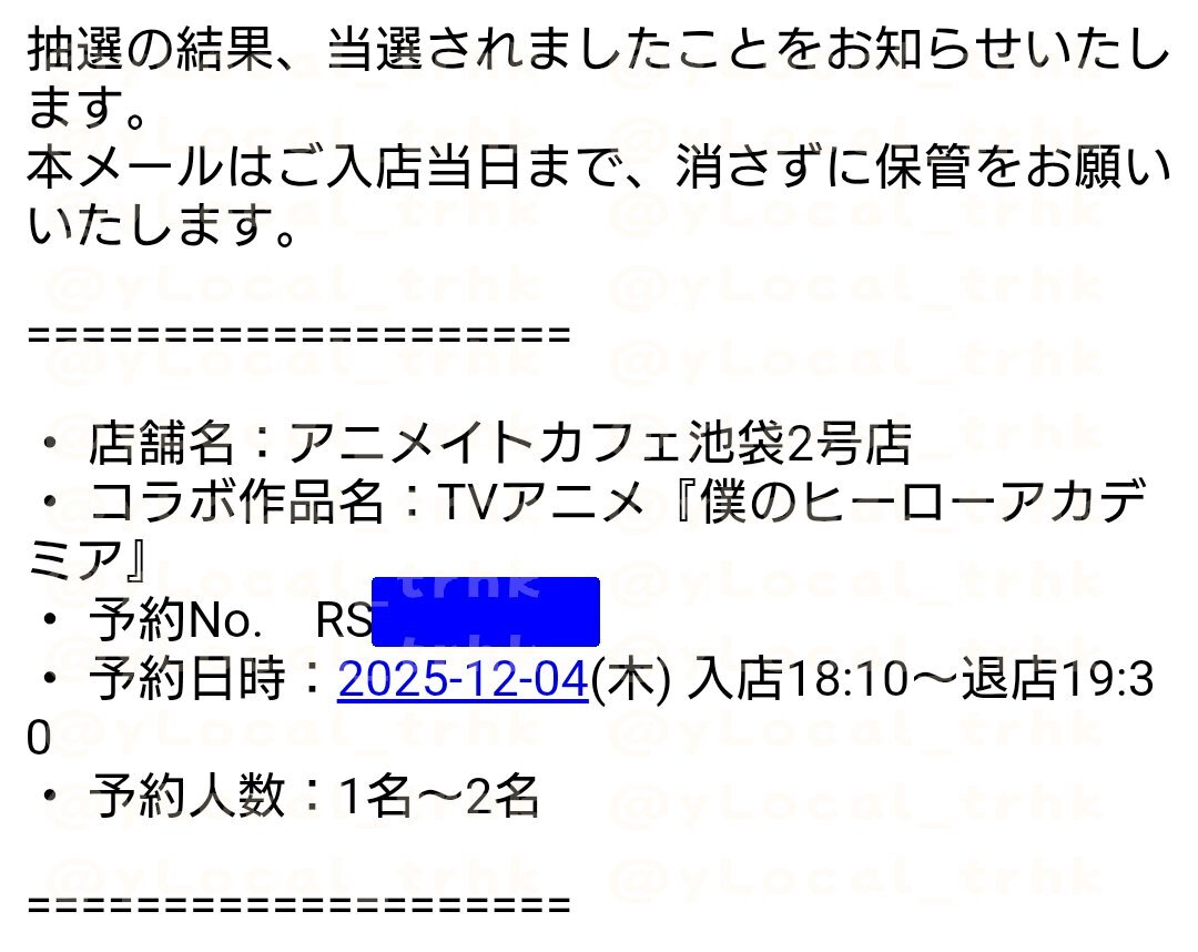 *RT不要* 緩募 ヒロアカ アニカフェ 池袋 #yl取引 まさかの当選してたので、お探しの方がいましたら😅 【当選日】 12/4 18:10 【条件】 ・20分程度の遅刻了承済の方 ・テーブル会計 ・轟/麗日を優先可能な方 ・グッズ協力は不要 ・過度な食べ残しのない方 代行ももしかしたらできるかもです🤔 pic.x.com/0cSGxr5eK1
