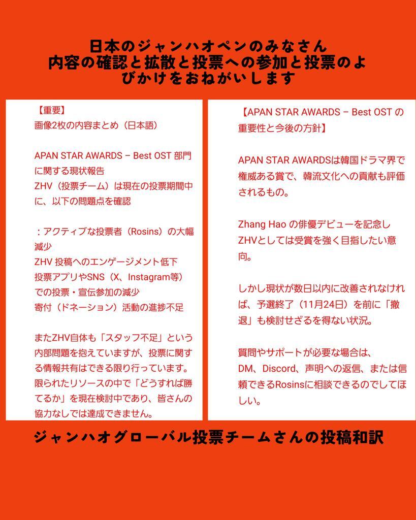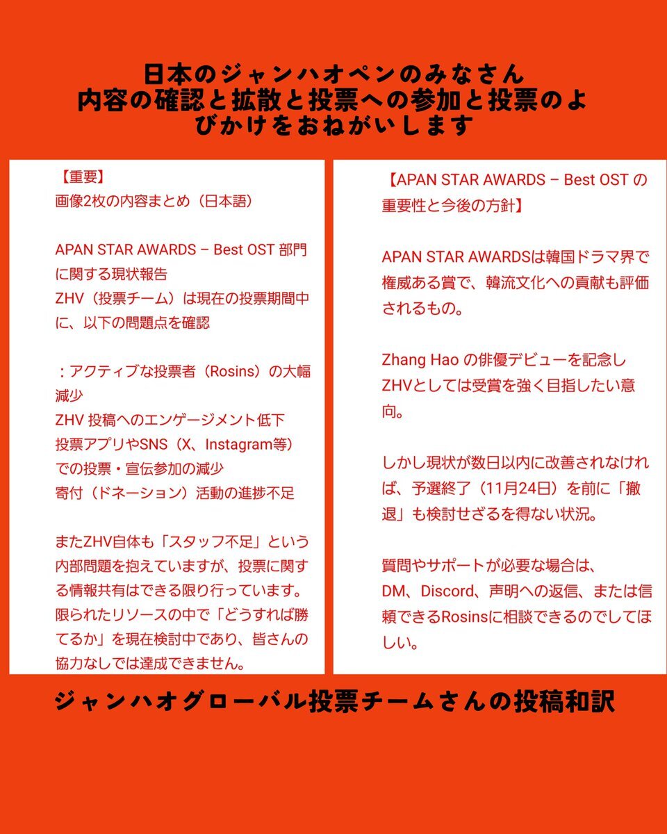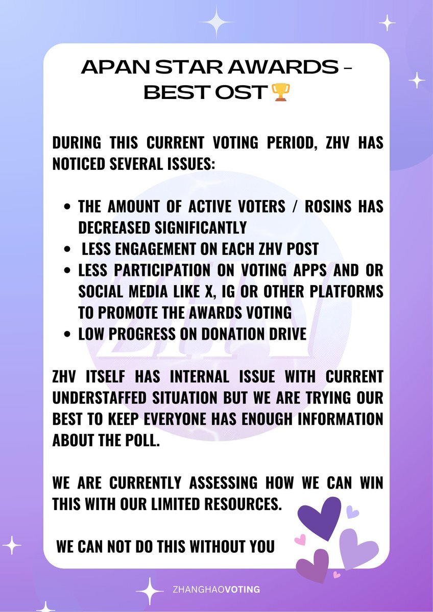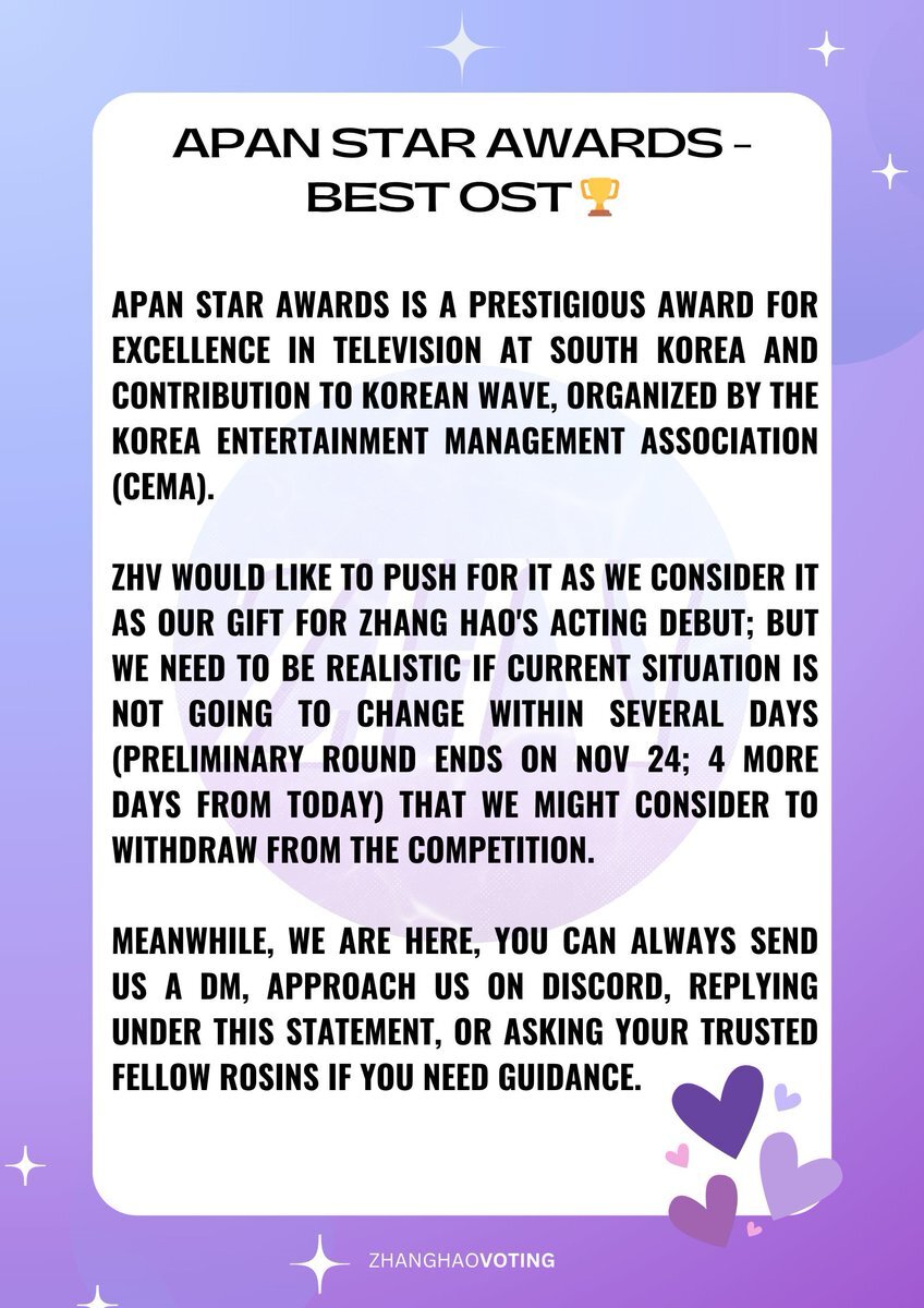 [📣] APAN STAR AWARDS - BEST OST 🏆 🚨SHOULD WE CONTINUE TO PURSUE IT OR DROP IT? ‼️PLEASE READ THE WHOLE STATEMENT‼️ *️⃣ ZHV Recruitment 🔗docs.google.com/forms/d/e/1FAI… *️⃣ DONATE 🔗ko-fi.com/zhanghaovoting *️⃣ TUTORIALS Check our Pinned Tweet 📌 *️⃣ If you need gmail to make new