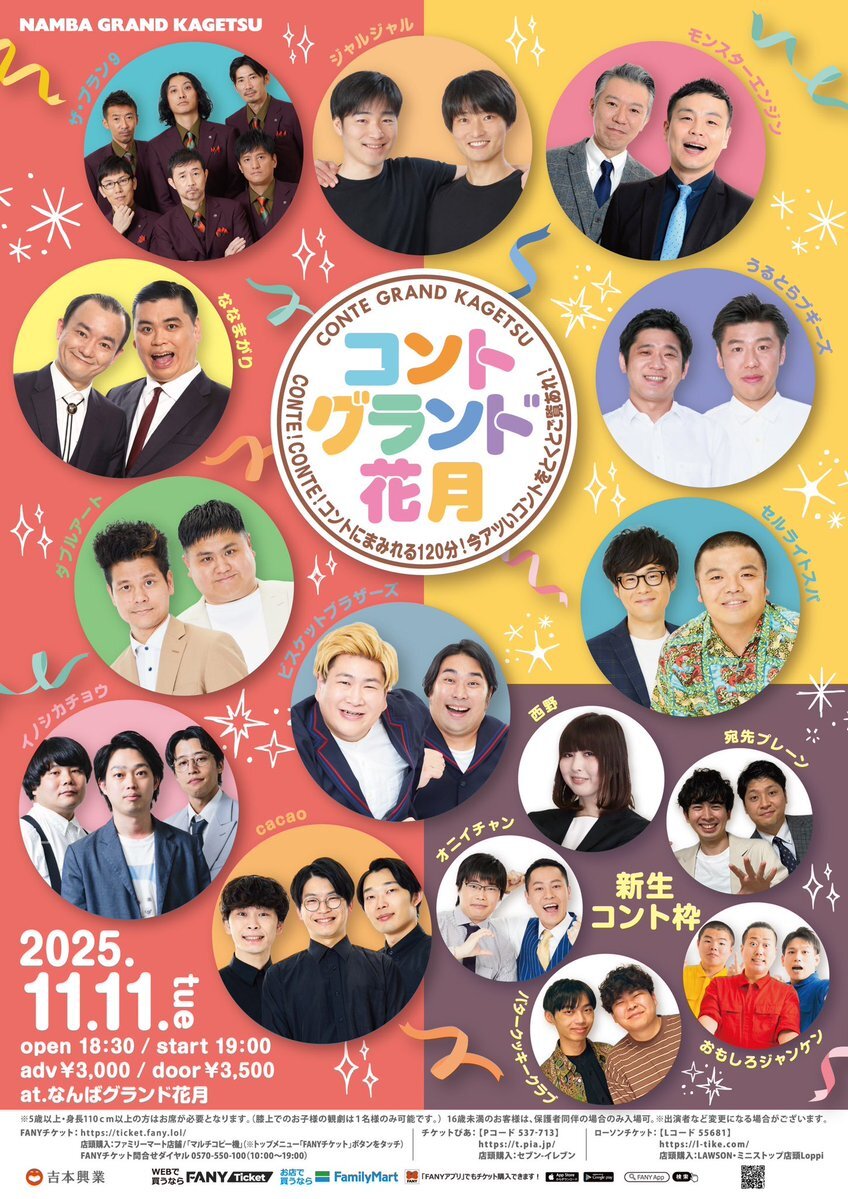 【舞台】コントグランド花月~CONTE!CONTE!コントにまみれる120分!今アツいコントをとくとご覧あれ!~ 2025年11月11日(火)19:00〜 なんばグランド花月 🎫3,000円 出演:出演:ザ・プラン9/ジャルジャル/モンスターエンジン/ななまがり/うるとらブギーズ/ダブルアート/セルライトスパ他