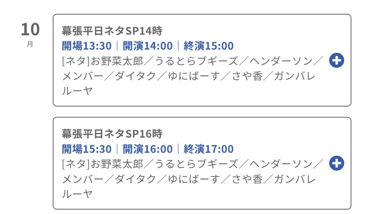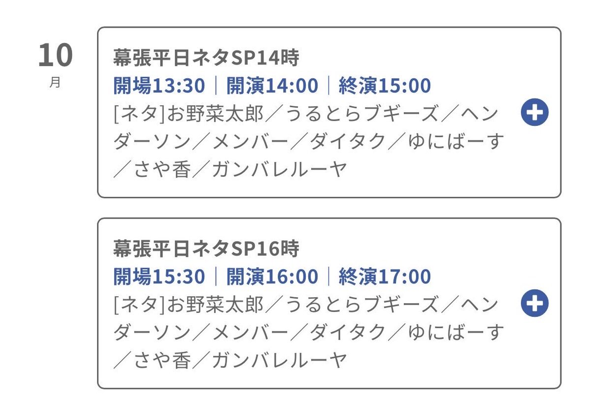 【明日の出演】①.② 幕張駅平日ネタSP 11/10(月)14:00/16:00 ▷よしもと幕張イオンモール劇場 🎫前売2500円/当日3000円 📱配信なし お野菜太郎/うるとらブギーズ/ヘンダーソン/メンバー/ダイタク/ゆにばーす/さや香/ガンバレルーヤ