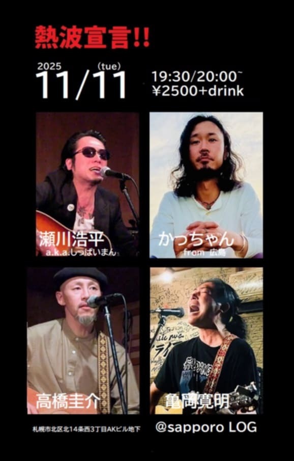 11/11(火) 札幌 LOG (北海道札幌市北区北14西3 AKビル地下1階/011-737-5388) 「熱波宣言!!」 開場/19:30 開演/20:00 ¥2500+ドリンクオーダー かっちゃん(広島) 瀬川浩平 a.k.a しっぱいまん 亀岡寛明 高橋圭介 明日どうぞよろしくお願いします! pic.x.com/Gbri58vTAP