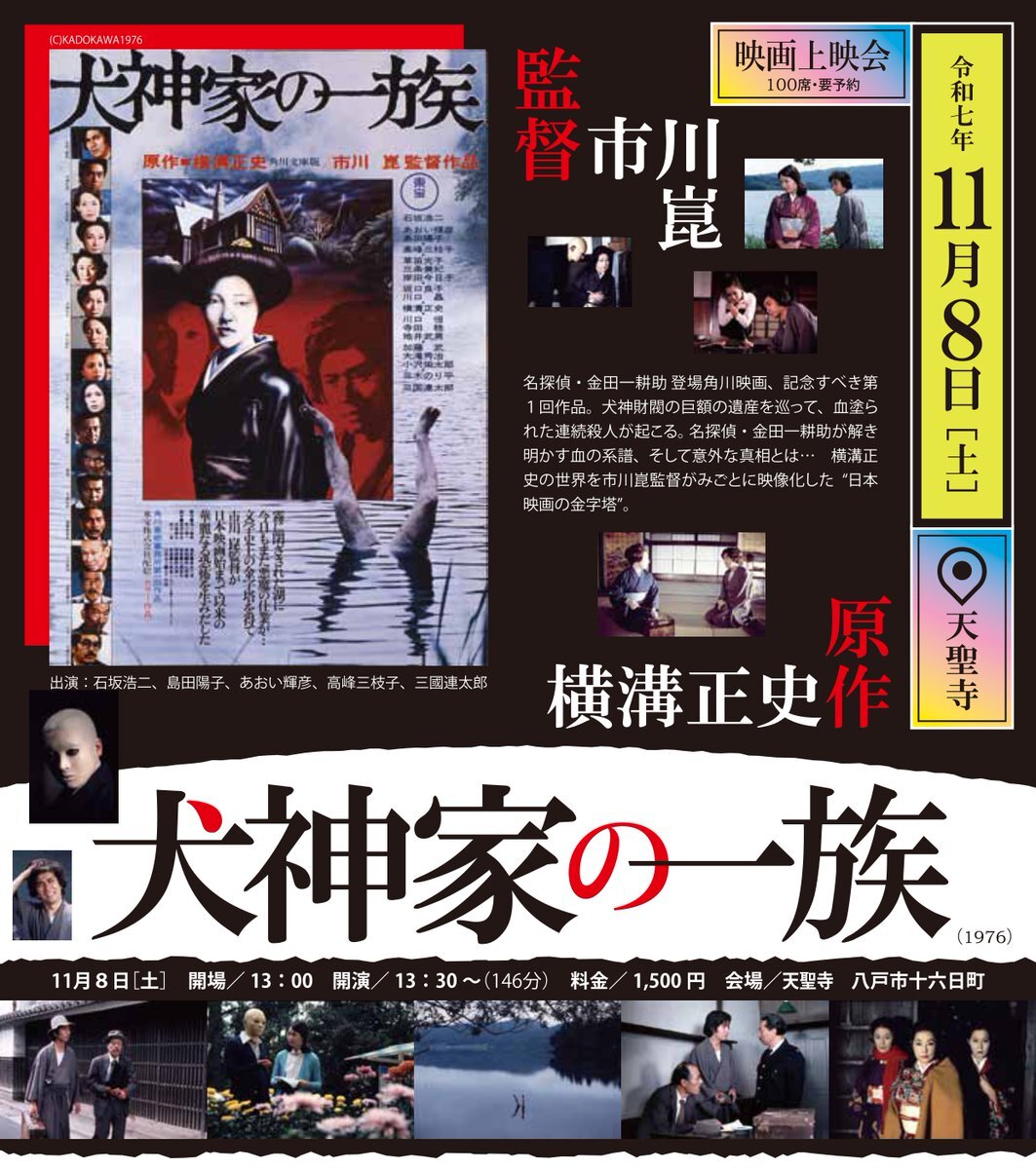 🎬寺で犬神家🐶 昭和シネマ百景の締めくくりとなる上映です! 2025/11/8(土) 13:00開場 / 13:30開演 / 146分 『犬神家の一族』(1976) 【限定100席】 料金 / 1,500円(当日現金払い) 会場 / 天聖寺 (青森県八戸市十六日町27) ご予約は⇩ peatix.com/event/4478536