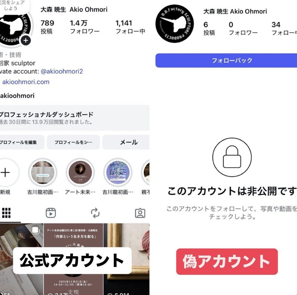 友人知人よりInstagram偽アカウントの報告をいただきました。 くれぐれもフォローしないようご注意下さい。 ご報告くださいました皆さま、どうもありがとうございます。 彫刻家 大森暁生 大森暁生 official site akioohmori.com/voice/fake-acc… pic.x.com/HPYhMbOejX