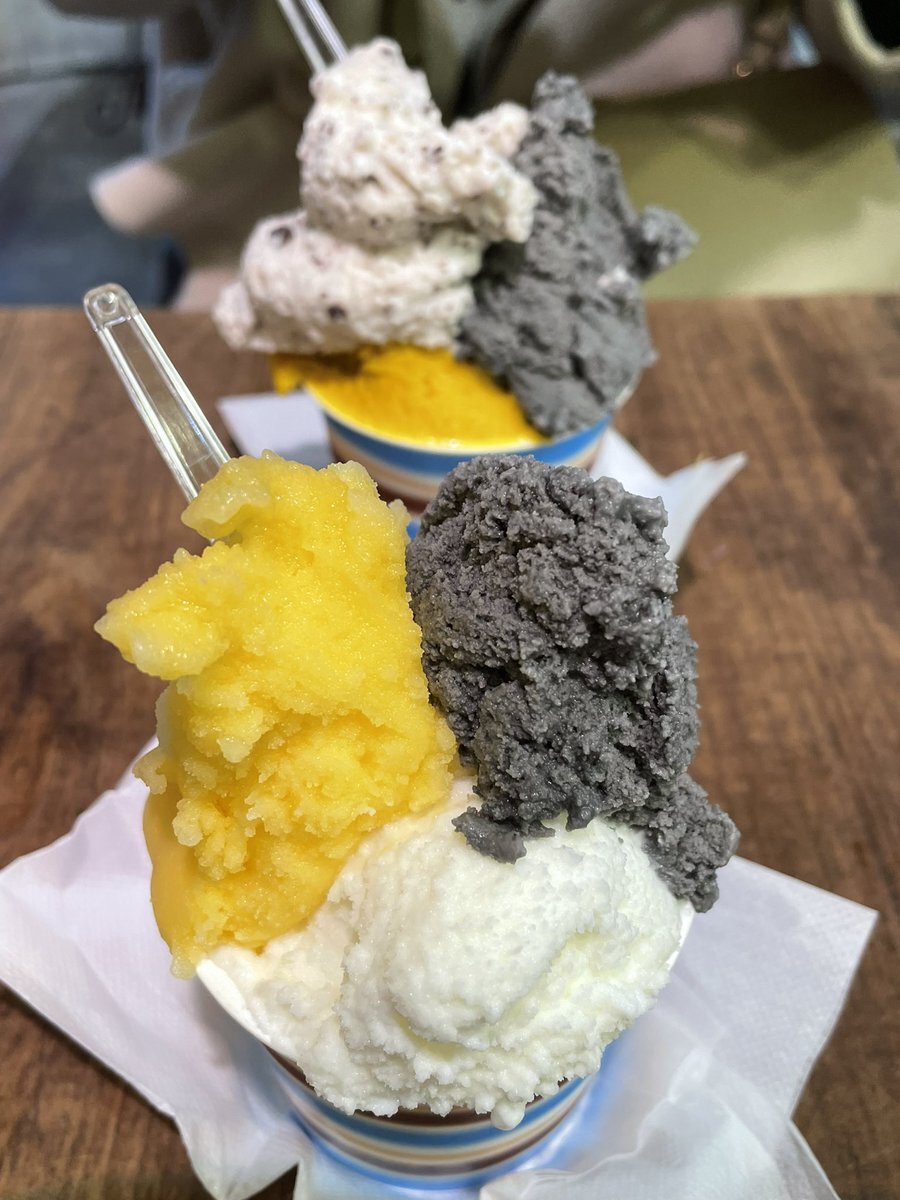 兄レトロ合間は紅葉さんお勧めのあかね製麺へ。肉うどん小とエビ天ナス天。柔め甘めだったが美味しかった。三びきの子ぶたへも行きタマゴチキン南蛮BLTフルーツサンドをテイクアウトで購入。toitoitoiではミルクイチジクミカンをコーンで食し感動。紹介店全制覇、バスで琴電で徒歩で街と港も満喫した。 pic.x.com/2qqxTksXDc