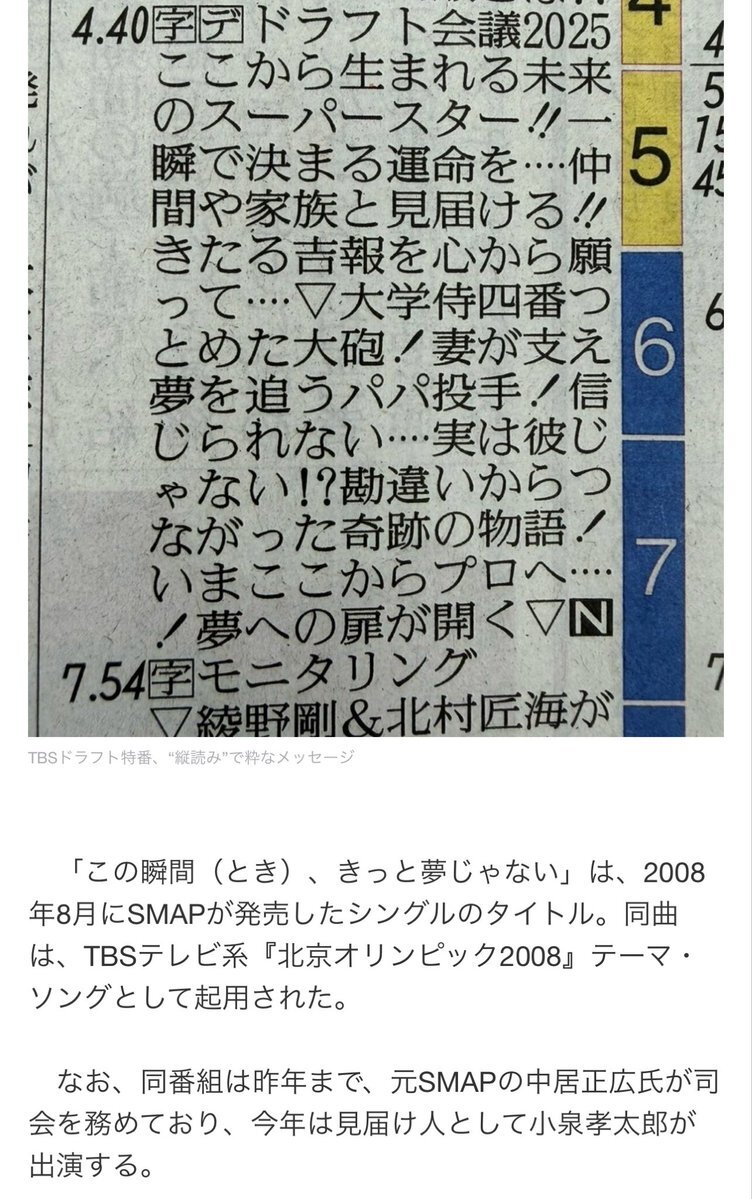 【すごい】TBSドラフト特番、“縦読み”で粋なメッセージ SMAP楽曲タイトルに news.livedoor.com/article/detail… 新聞のテレビ欄を縦に読むと「この瞬間きっと夢じゃない!」となっている。2008年8月にSMAPが発売したシングルのタイトルになっており、同番組は昨年まで、元SMAPの中居正広氏が司会を務めていた。 pic.x.com/6APuJ6kxok