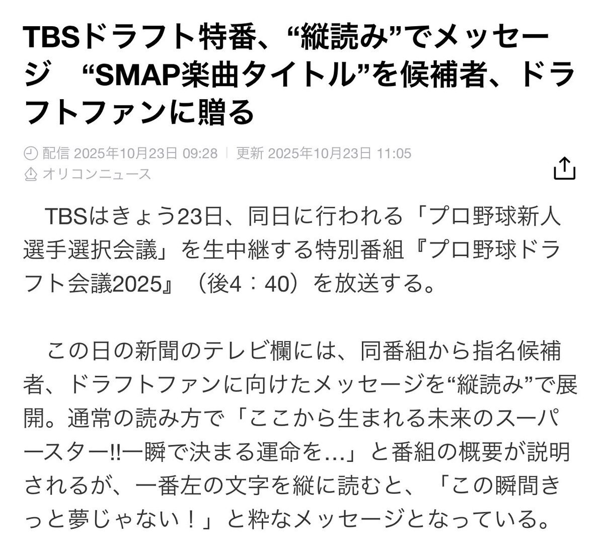TBSお仲間スポニチのみ早々の5時に出した ネットニュース。 #SMAP #この瞬間きっと夢じゃない 【記事全文】TBS生中継「ドラフト会議2025」 今年もテレビ欄に粋な隠れメッセージ! さあ、運命の一日が始まる - スポニチ Sponichi Annex 野球 sponichi.co.jp/baseball/news/…