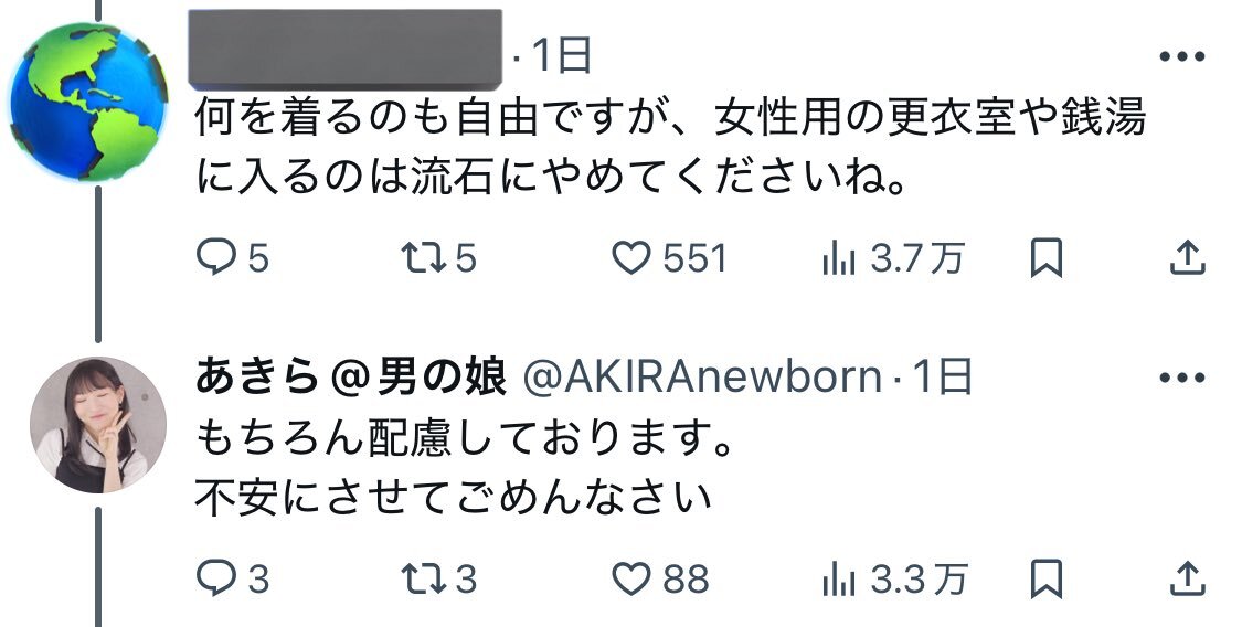 返信先:@5qdyoxMQMSO9QJ7他1人はい。多くは「更衣室や銭湯には配慮して入らない」と発言しているが、実際には女性用下着店に入店をしており その投稿には「女装やサラリーマン男性も買いにくる😆」と無邪気に女性の尊厳を踏み躙る(この解釈は昨今のトランスジェンダーによる加害事例によるもの)行為に対する困惑、不安感情です