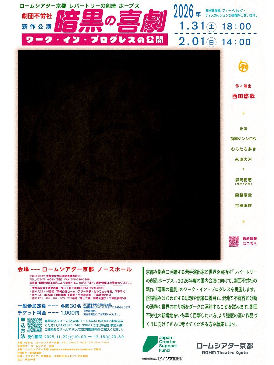 Next ▶︎▶︎▶︎ ◤ ̄ ̄ ̄ ̄ ̄ ̄ ̄ ̄ ̄ ̄ ̄ ̄ ̄ ̄ ̄ ̄ ロームシアター京都 10周年記念事業 レパートリーの創造 ホープス 西田悠哉/劇団不労社『暗黒の喜劇』 ワーク・イン・プログレスの公開 _________________◢ 2026年 1月31日(土)18:00 /2月1日(日) 14:00