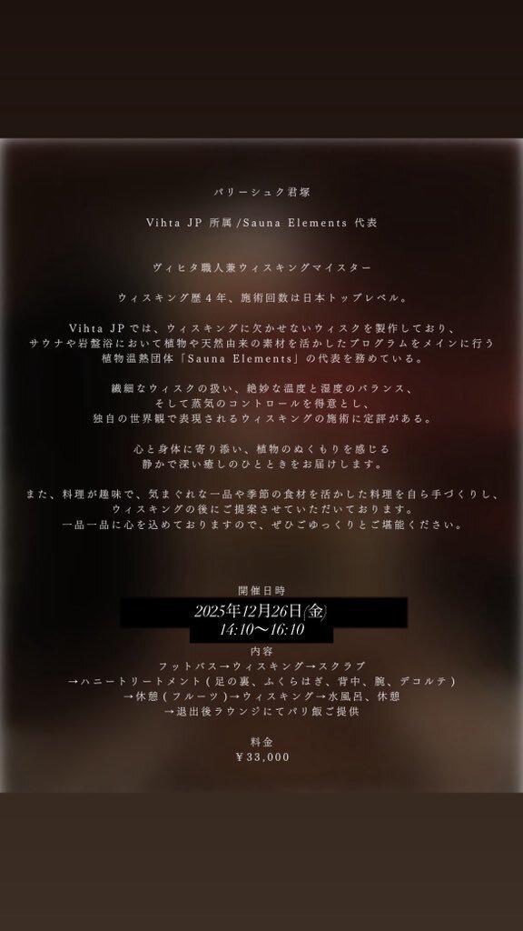 おはようございます😃 船橋快晴☀️ 寒暖差が激しいです! サウナで身体温めませんか? 本日のアールイー パリーシュク君塚さんによるプレミアムウィスキング開催🌿@Parishuku_Kimi 「Herbal Communion ― 森ノ食儀 ― 」 ↑こちらのイベントはご予約🈵枠となっております🙇