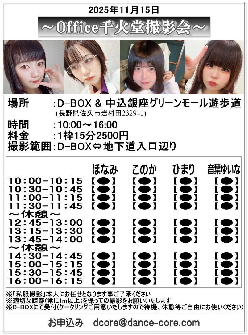 本日はこちら ~Office千火堂撮影会~ ご予約頂いた皆様ありがとうありがとうございます😊 ご予約時間迄にお越し下さい。 D-BOX&中込銀座グリーンモール遊歩道は落ち葉がたくさん🍂 ケータリングもご用意いたしますのでご自由にお過ごし下さい。 お待ちしております🙇🏻 pic.x.com/SWksHJnsqR